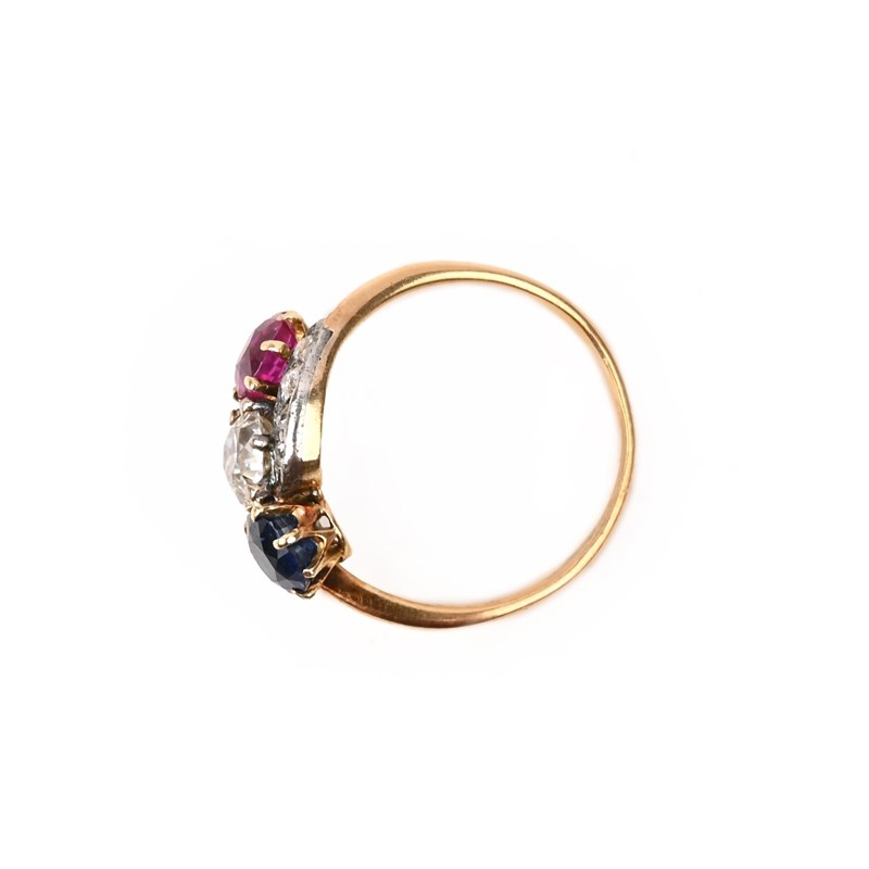A LATE 19TH CENTURY RUBY, SAPPHIRE AND DIAMOND THREE-STONE RING