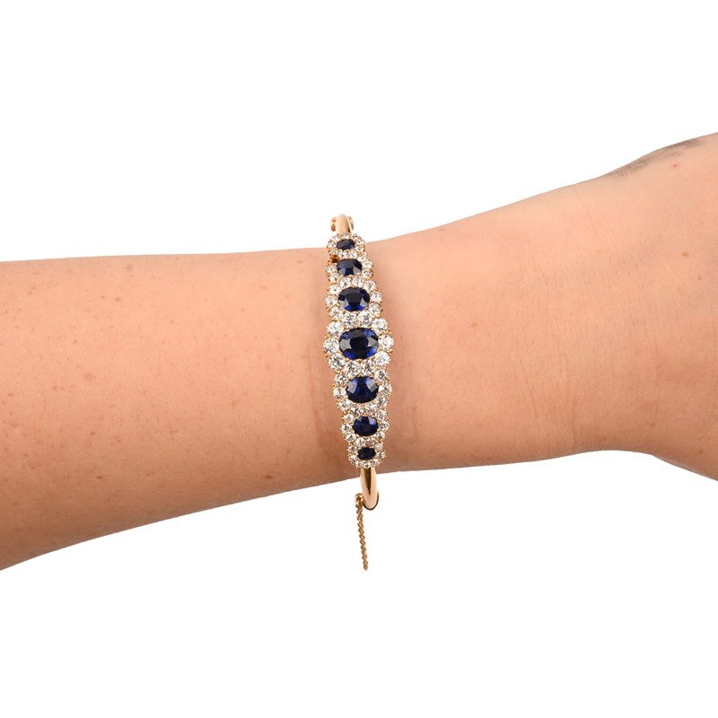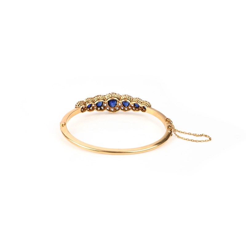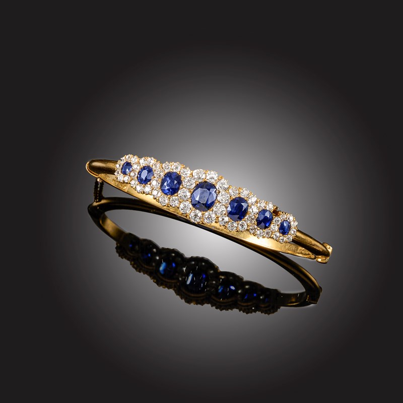 A LATE VICTORIAN SAPPHIRE AND DIAMOND HINGED BANGLE BY HENRY GRIFFITH & SONS, CIRCA 1895, set with seven oval-cut sapphires within entwined borders of old European-cut diamonds, mounted in 18ct yellow gold, maker's mark H G & S, hallmarks for Chester, 1895-6, inner circumference 16.5cm, case