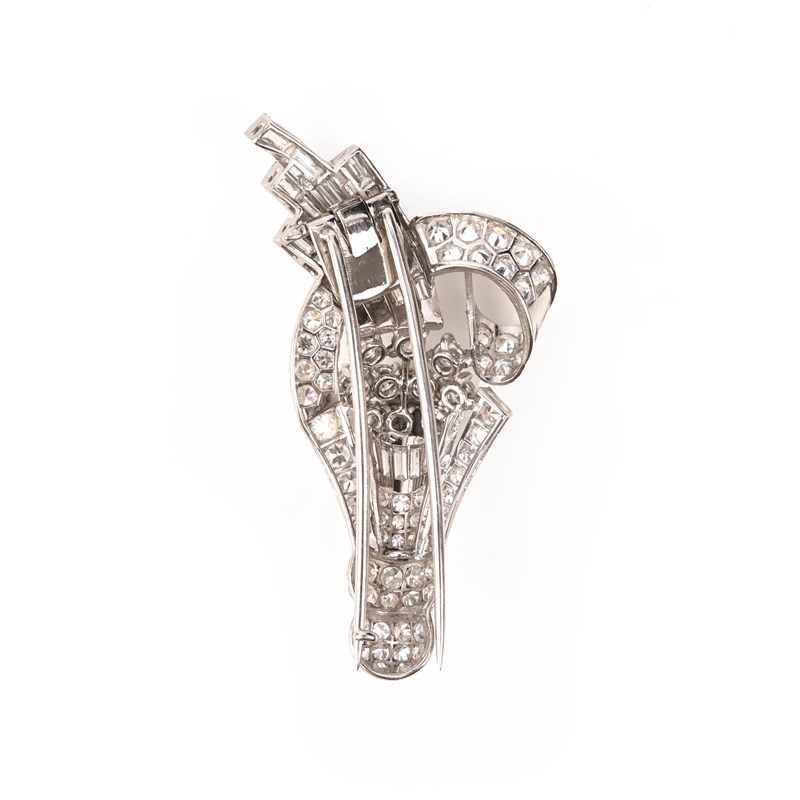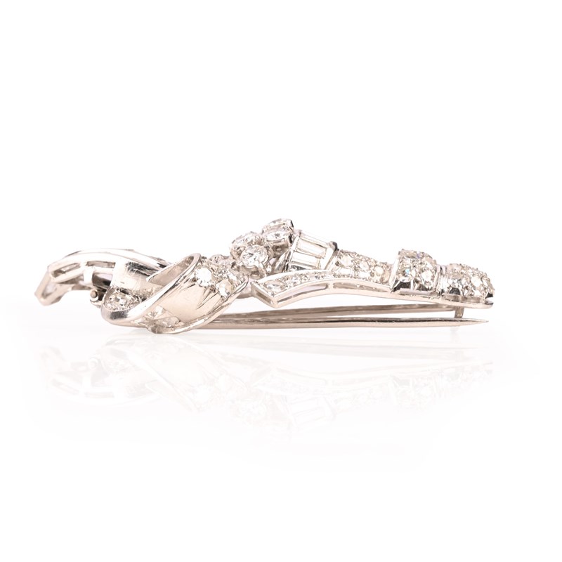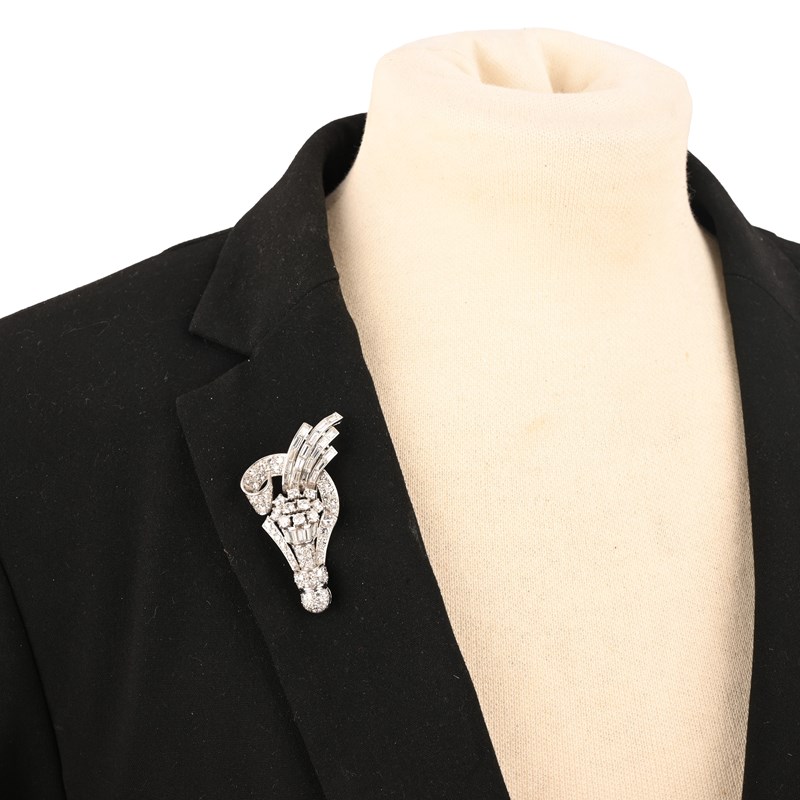 A DIAMOND SPRAY BROOCH, MID 20TH CENTURY, designed as a stylised cornucopia, set with circular-cut and baguette-cut diamonds, mounted in platinum, length 5.5cm