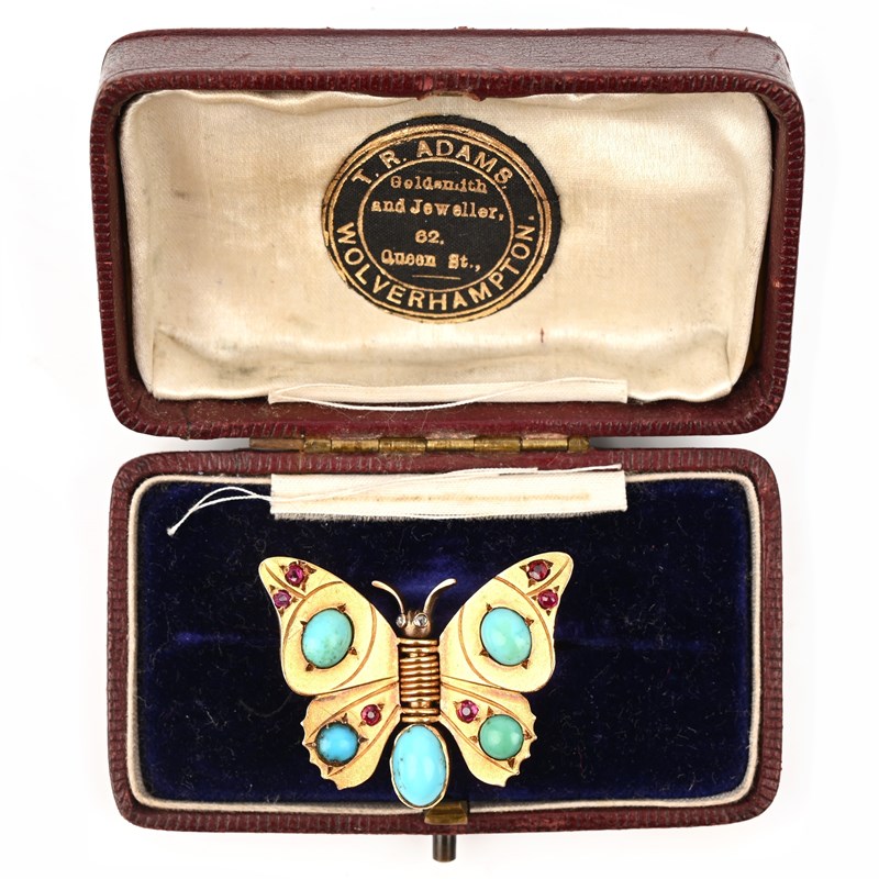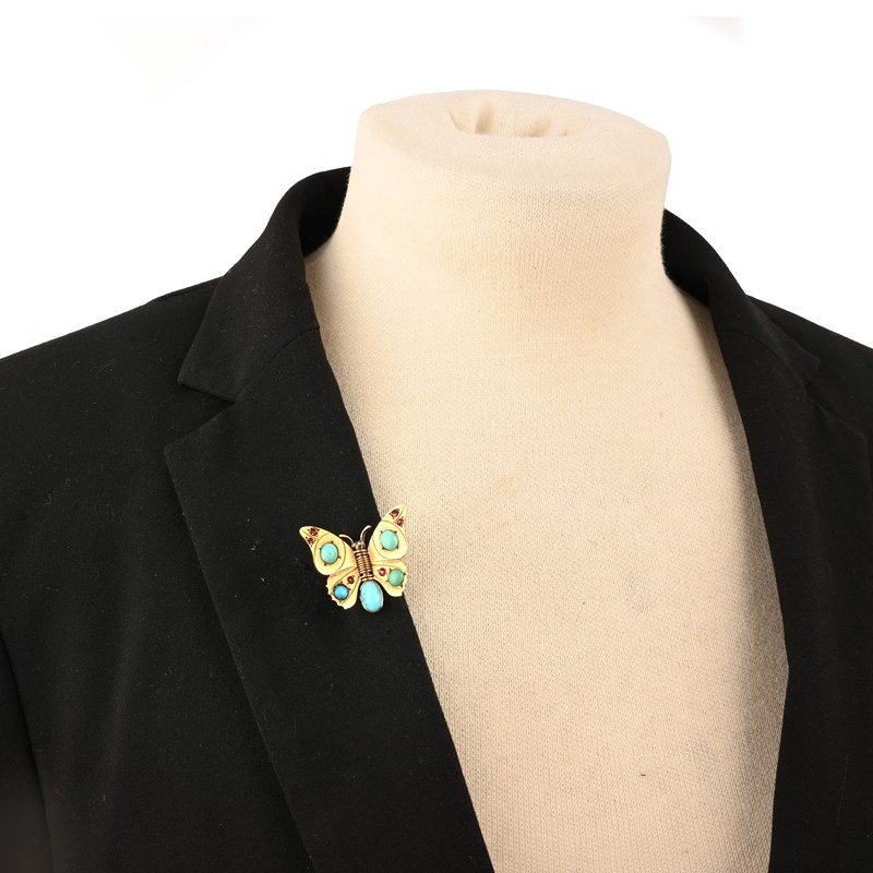 RENÉ BOIVIN, A GEM-SET GOLD BROOCH, 1957, designed as a butterfly, set with turquoise cabochons and circular-cut rubies, the head with diamond-set eyes, French control marks and maker's mark, width 3.3cm, gross weight 10g, case