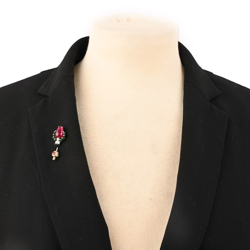 A RUBY, EMERALD AND DIAMOND JABOT PIN
