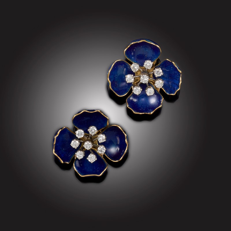 A PAIR OF DIAMOND AND ENAMEL EARCLIPS, CIRCA 1958