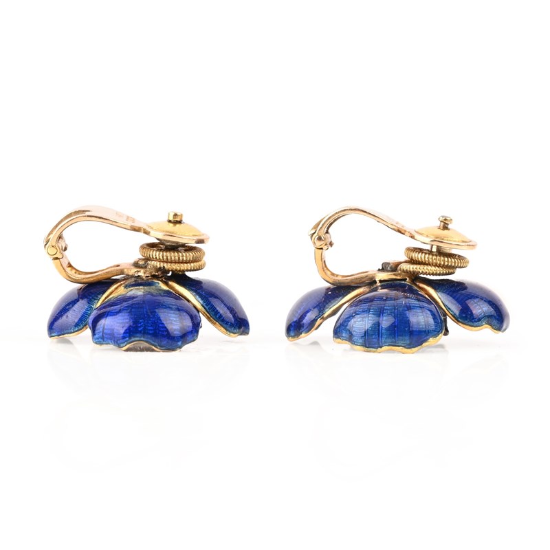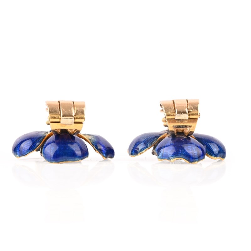 A PAIR OF DIAMOND AND ENAMEL EARCLIPS, CIRCA 1958, each designed as a flowerhead, decorated with blue guilloché enamel petals in 18ct yellow gold centred with platinum pistils each set with a round brilliant-cut diamond, London hallmarks for 1958, clip and screw fittings, width 2.3cm, gross weight 15g, one earring with enamel chipped to reverse