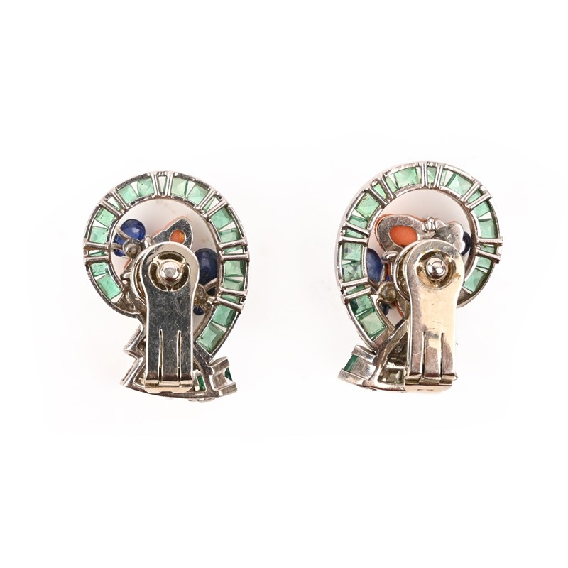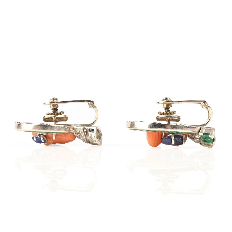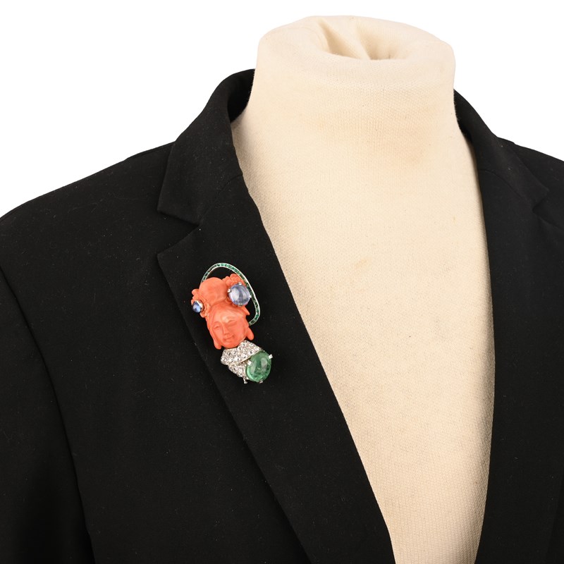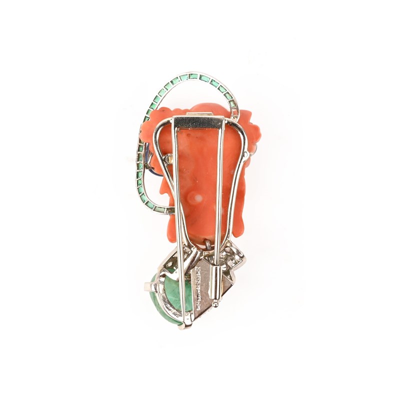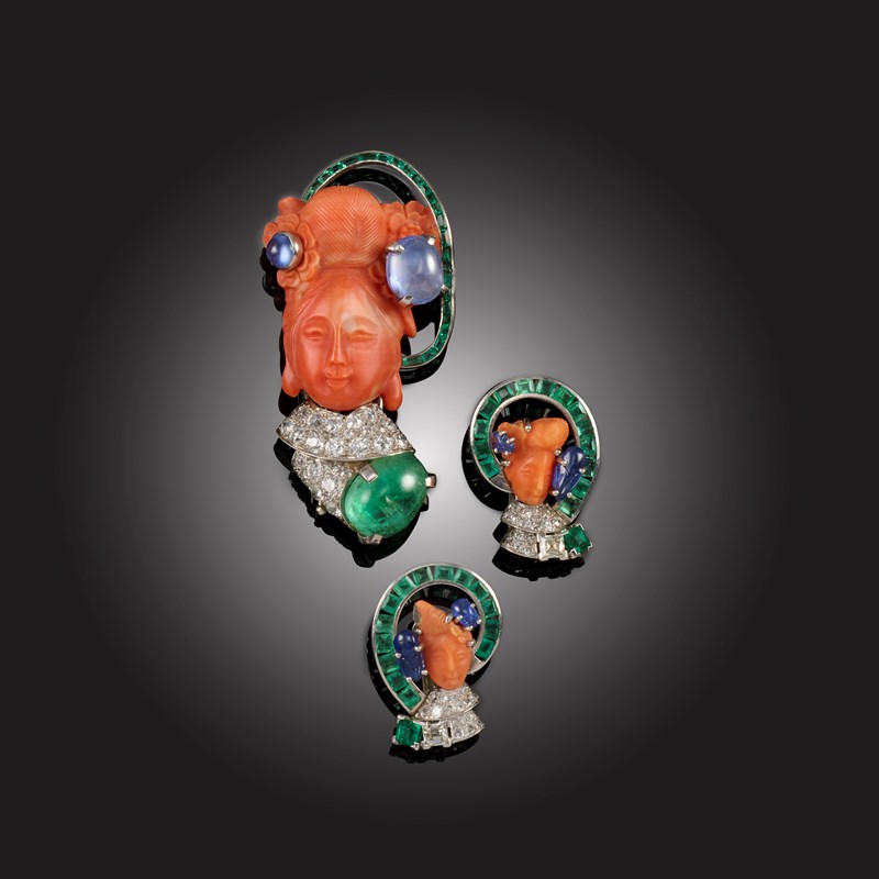 λ SEAMAN SCHEPPS, A CORAL AND GEM-SET DEMI-PARURE, comprising: a brooch, composed of a carved coral chinoiserie head, her hair ornamented with sapphire cabochons and framed with a row of channel-set calibre-cut emeralds, her robe pavé-set with old circular-cut diamonds above an emerald cabochon, mounted in platinum and white gold, signed Schepps Seaman, length 6cm, one emerald missing; and a pair of en-suite earclips, each composed of a carved coral chinoiserie head with carved sapphire cabochons to her hair, wearing a diamond-set robe with a step-cut diamond and emerald, all beneath a scrolled frame of channel-set carré-cut emeralds, in platinum and white gold, signed Seaman Schepps, clip fittings, length 2.7cm; fitted case