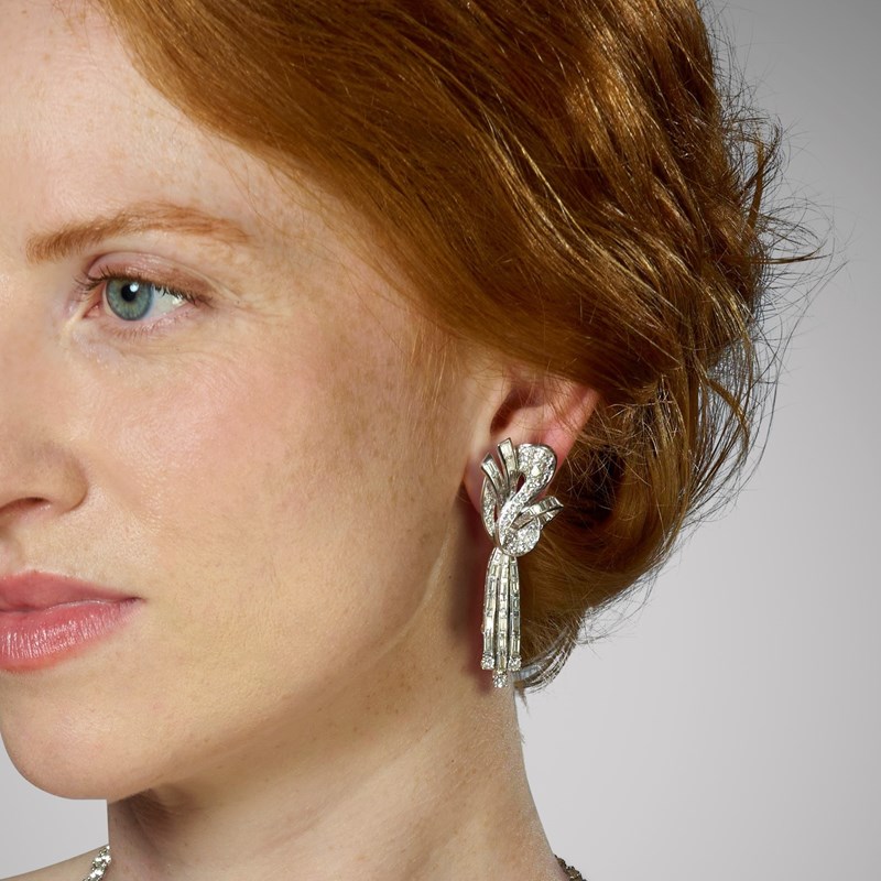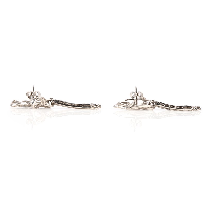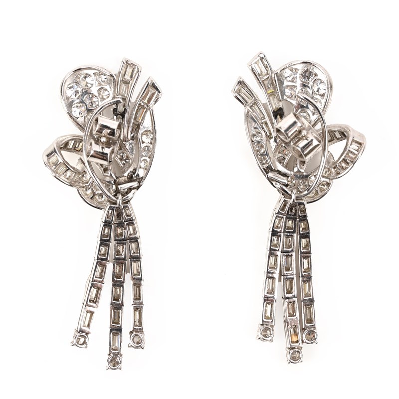 A PAIR OF DIAMOND 'DAY & NIGHT' EARRINGS, MID 20TH CENTURY, with pierced scrolling surmounts suspending detachable articulated tassel drops, set with round brilliant-cut and baguette-shaped diamonds, mounted in platinum, post fittings, length 5.5cm