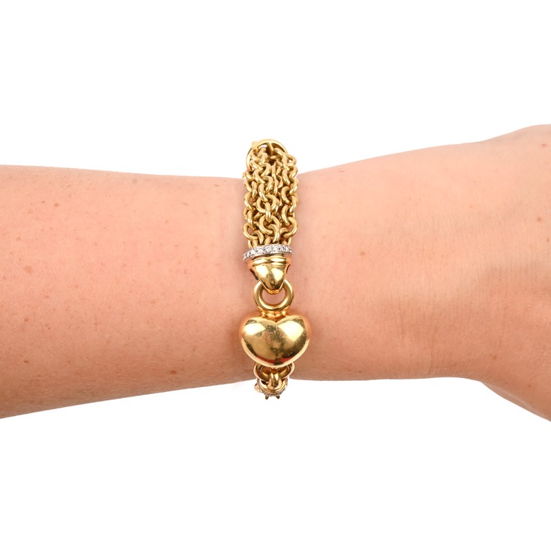 KUTCHINSKY, A DIAMOND AND 18CT GOLD BRACELET, CIRCA 1991, of assymetric design, of circular linking suspending a heart-shaped pendant pavé-set with round brilliant-cut diamonds and another plain heart-shaped pendant, the other half a cluster of four circular-link strands between a diamond-set terminal and a plain terminal, the two halves conjoined by a large heart-shaped link, maker's mark for Kutchinsky, London import marks for 1991, Italian control marks, length 18cm, gross weight 54g