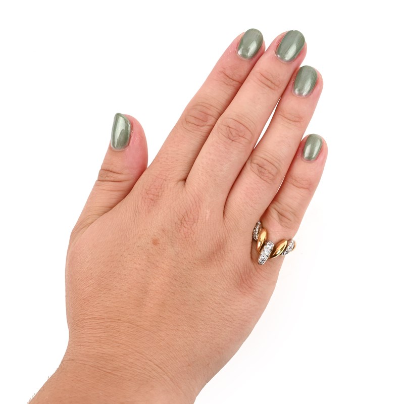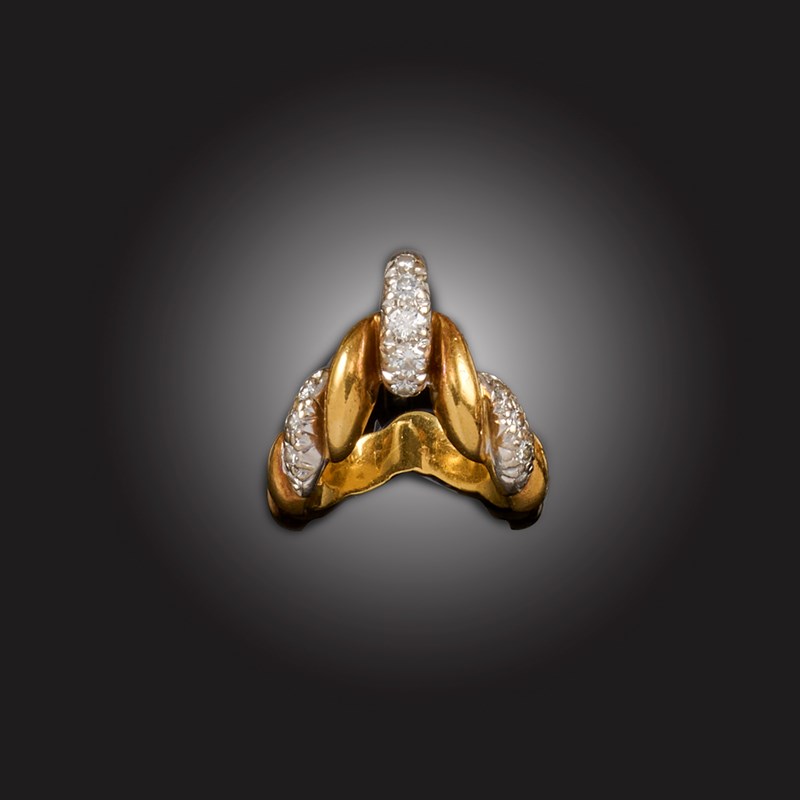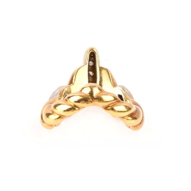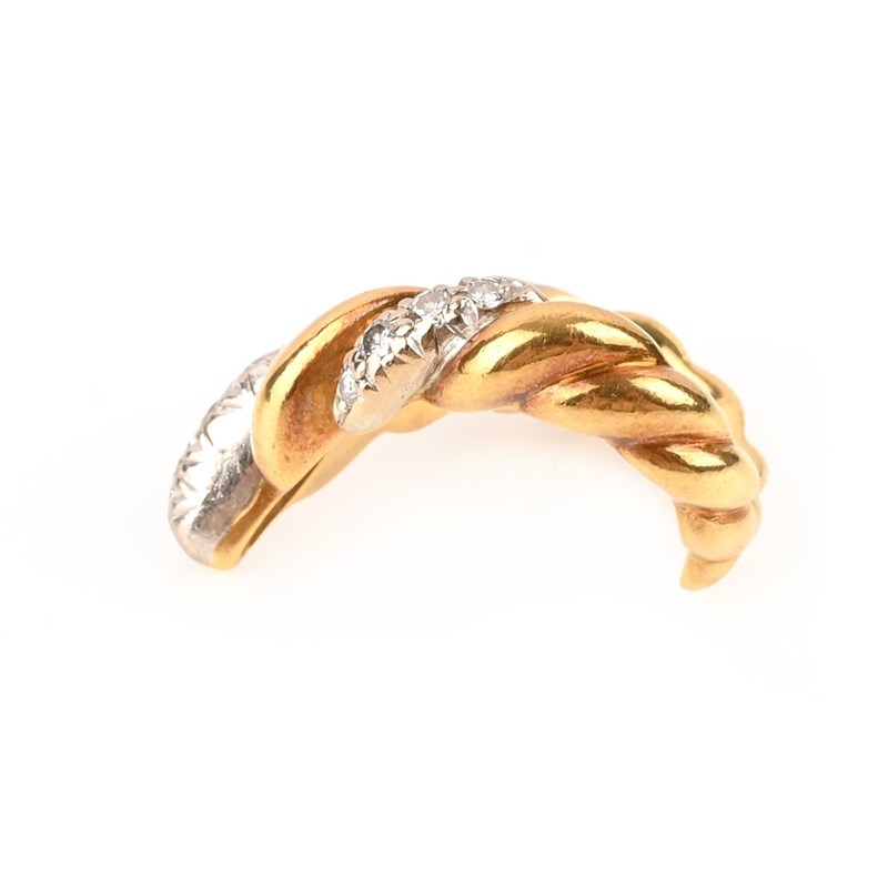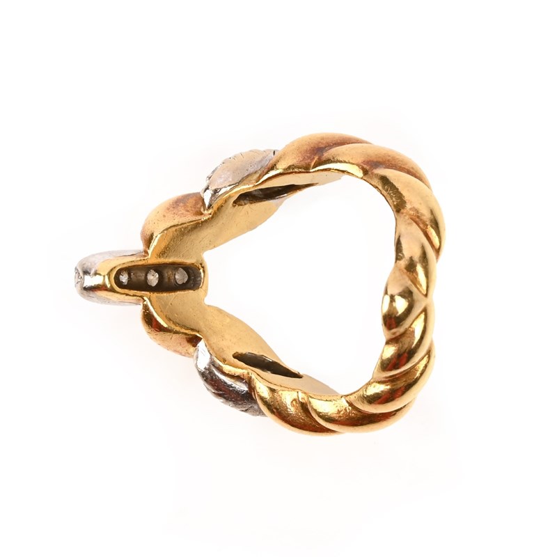 KUTCHINSKY, A DIAMOND AND 18CT GOLD RING, CIRCA 1975, of wishbone design, formed as a stylised ropetwist motif with alternating sections set with round brilliant-cut diamonds, in white and yellow 18ct gold, maker's mark for Kutchinsky, London hallmarks for 1975, size approx. I 1/2, case stamped Kutchinsky