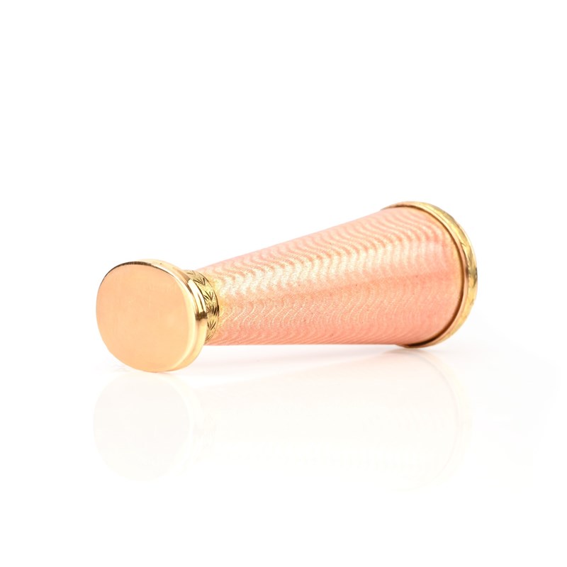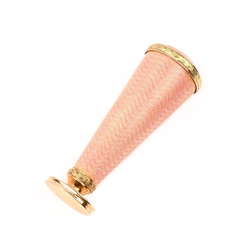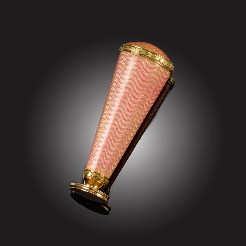 ANDREI ADLER, AN EARLY 20TH CENTURY RUSSIAN GOLD AND ENAMEL DESK SEAL, CIRCA 1908-1912, of tapering cylindrical form decorated with guilloché enamel and gold mounts, terminating in a blank seal, with makers marks for AA Andrei Adler, stamped 72 and with a kokoshnik, length 7cm