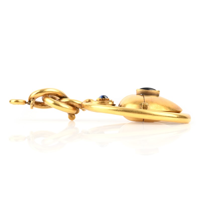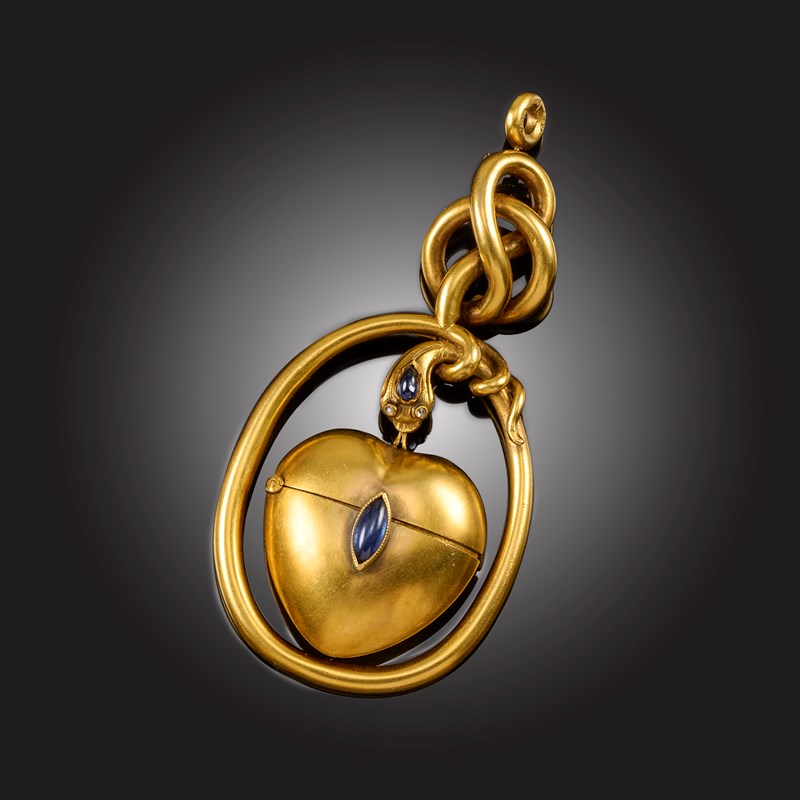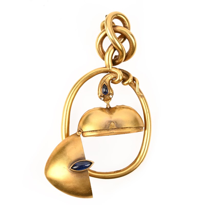FRIEDRICH KOECHLI, A LATE 19TH CENTURY GEM-SET GOLD VINAIGRETTE PENDANT, CIRCA 1892, in the form of a snake, its head set with rose-cut diamond eyes and a cabochon pear-shaped sapphire, suspending a heart-shaped hinged vinaigrette from its mouth, the vinaigrette mounted with a collet-set cabochon sapphire, the snake's body of scrolling form suspended from a loop bail, bail stamped with maker's mark for Friedrich Koechli, *56 and date 1892, length 8cm