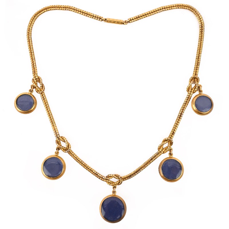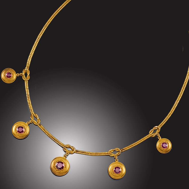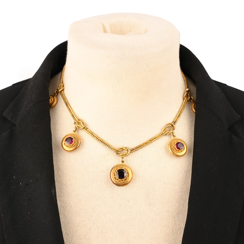 A VICTORIAN GARNET PENDANT NECKLACE, composed of a double snake-link chain with five reef knot motifs, each suspending a circular gold pendant set with a circular-cut garnet within ropetwist borders, each with a vacant glazed locket compartment to the reverse, max. pendant length 2cm, chain length 40cm, gross weight 31g
