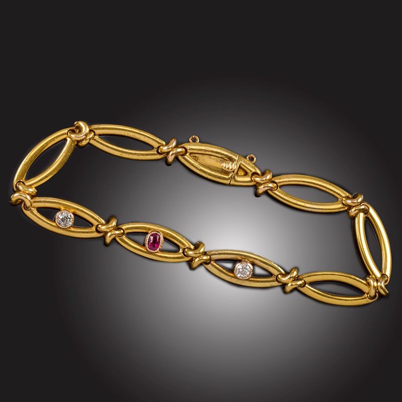 AN EARLY 20TH CENTURY RUBY AND DIAMOND BRACELET, composed of alternating pierced oval and crossover linking, the central oval link set with an oval ruby between two links each set with an old circular-cut diamond, in yellow gold, with Austrian import mark, length 17cm, gross weight 18g