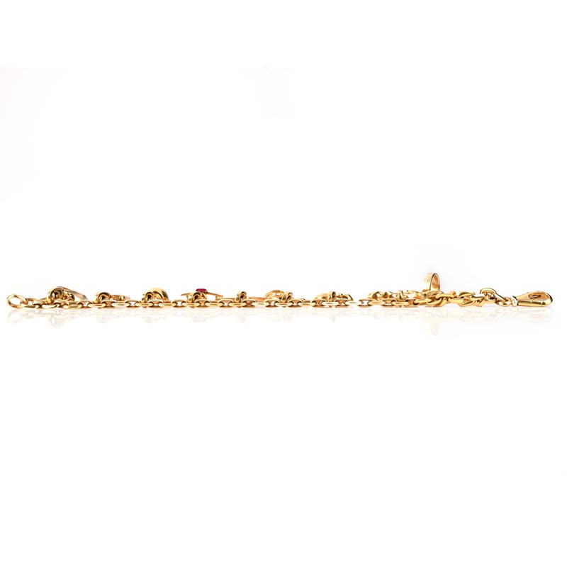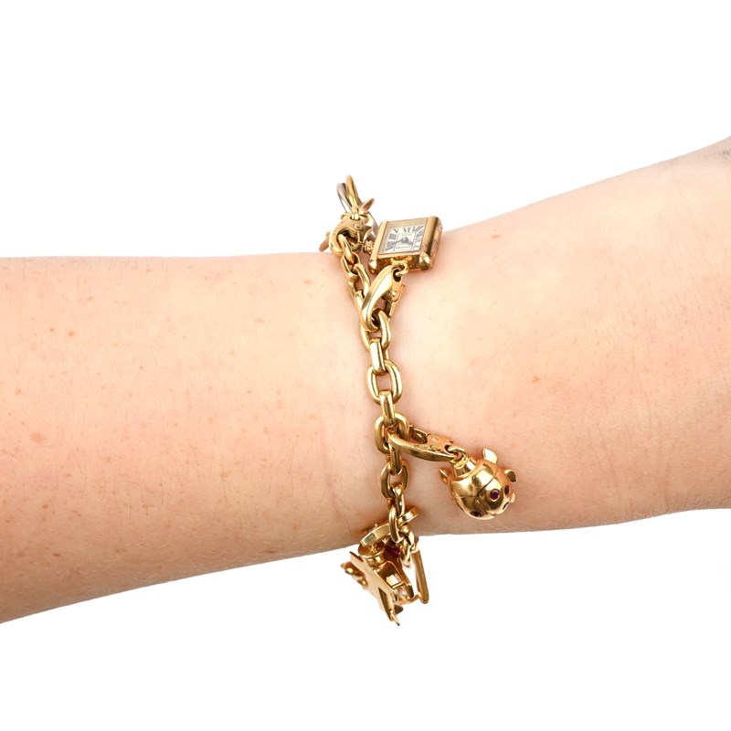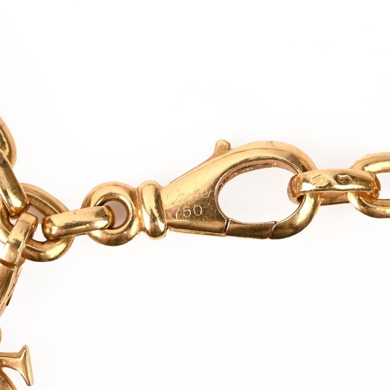 CARTIER, A FINE GOLD CHARM BRACELET, comprising ten Cartier charms including a tri-colour gold trinity ring, numbered 668849, signed Cartier, stamped 750, with maker's lozenge and French control marks, a Tank watch, numbered 681423, signed Cartier Paris, stamped 750, with maker's lozenge and French control marks, a ladybird, set with circular-cut rubies, numbered 695996, signed Cartier, stamped 750, with French control marks, an aeroplane, set with a step-cut ruby, numbered 692002, signed Cartier, stamped 750, with maker's lozenge and French control marks, an envelope, with an enamelled interlocking C postage stamp to one side, numbered 719209, signed Cartier, stamped 750, with French control marks, a standing flamingo, set with a circular-cut ruby eye and a plume of round brilliant-cut diamond set feathers, numbered 719810, signed Cartier, stamped 750, with maker's mark, French control marks and London import marks, an elephant, set with a cabachon emerald eye, numbered 679901, signed Cartier, stamped 750 with indistinct French control marks, a running panther, numbered 682974, signed Cartier, stamped 750, with French control marks, a love bangle, numbered 679001, signed Cartier, stamped 750, with French control marks, and an interlocking double C, numbered 683256, signed Cartier, stamped 750, with French control marks, to a curb link bracelet, numbered 660136, signed Cartier and stamped 750, length 18cm, gross weight 50g, cased