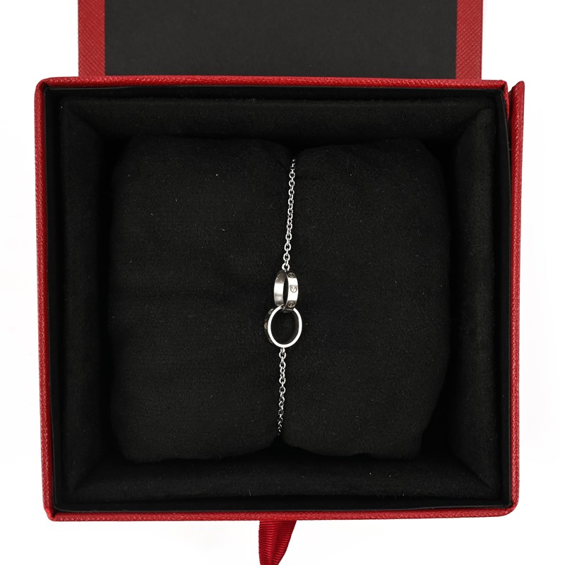 CARTIER, A WHITE GOLD 'LOVE' BRACELET, centring on two interlocking oval links detailed with screw motifs, to a fine-link white gold chain, signed Cartier and numbered IQ9260, Italian control mark, length 18.5cm, case