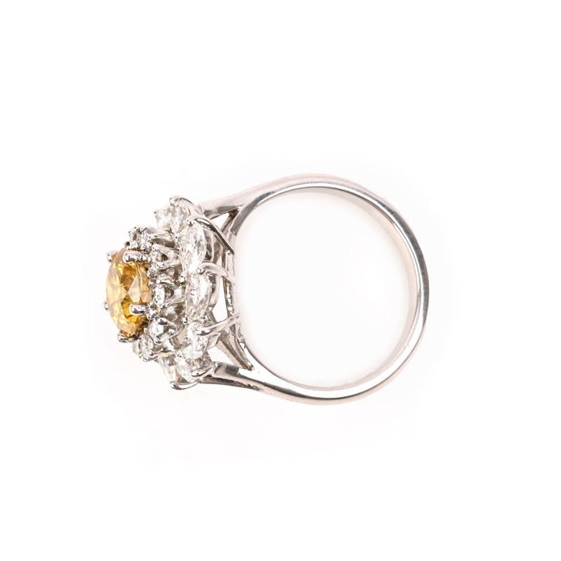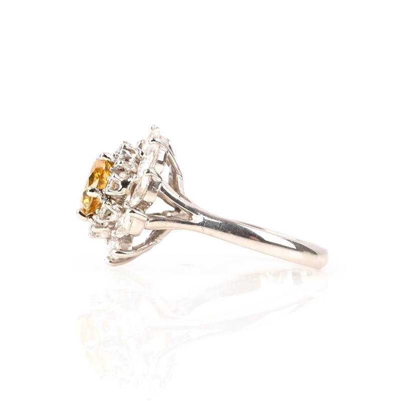 A FANCY DEEP ORANGY YELLOW AND WHITE DIAMOND CLUSTER RING, set with a round brilliant-cut fancy deep orangy yellow diamond weighing 1.45cts, within concetric borders of round brilliant-cut and marquise shaped white diamonds, mounted in 18ct white gold, London hallmarks for 2023, size M 1/2, gross weight 8g