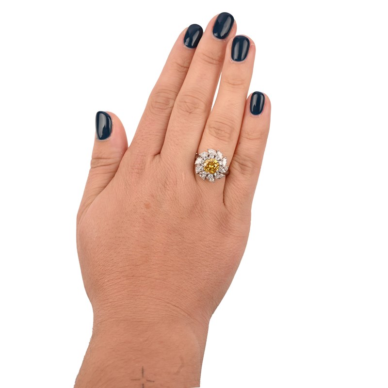 A FANCY DEEP ORANGY YELLOW AND WHITE DIAMOND CLUSTER RING