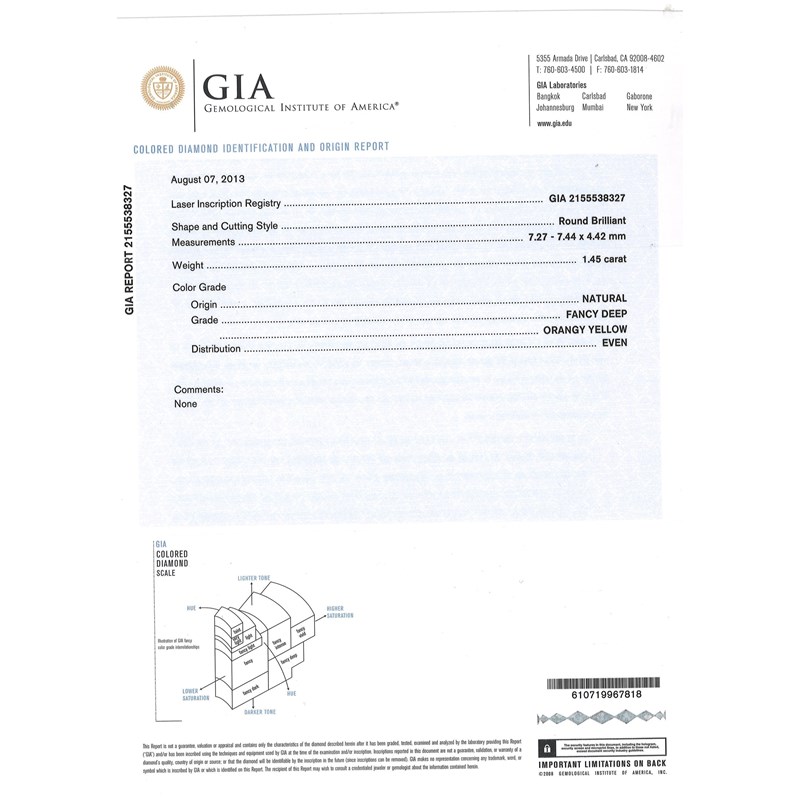 Accompanied by GIA report number 2155538327 dated 7th August 2013 stating that the round brilliant-cut diamond measuring 7.27-7.44 x 4.42mm and weighing 1.45cts is natural and fancy deep orangy yellow colour with even distribution