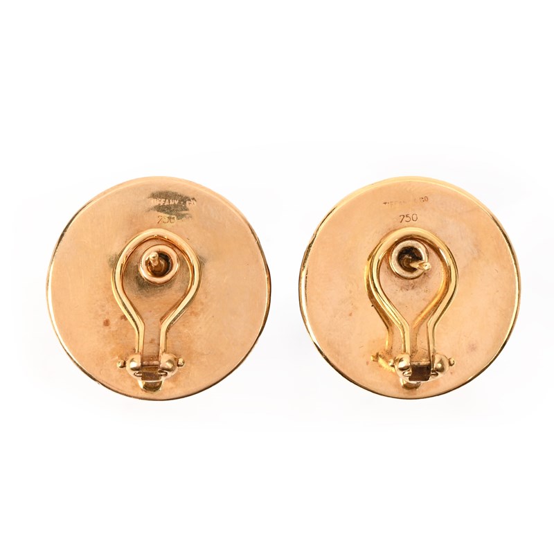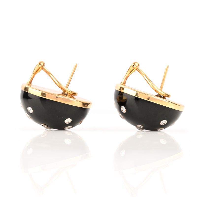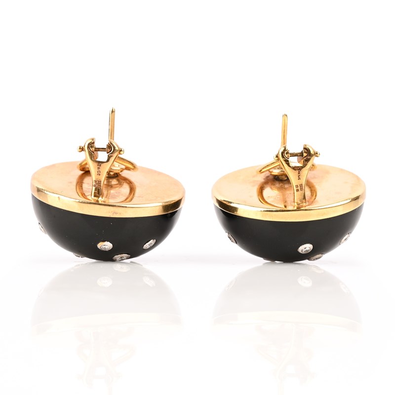TIFFANY & CO., A PAIR OF DIAMOND AND ONYX EARRINGS, 1989, of bombé design, decorated with graduated round brilliant-cut diamonds in gold collets, stamped 750, marked Tiffany & Co and with maker's mark T&Co, London import marks for 1989, diameter 2.4cm, post and clip fittings