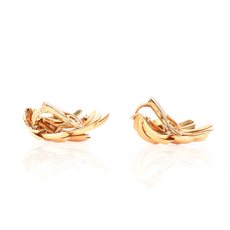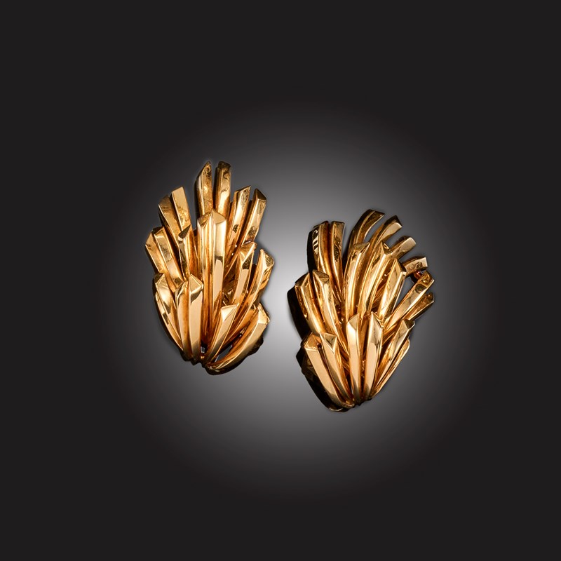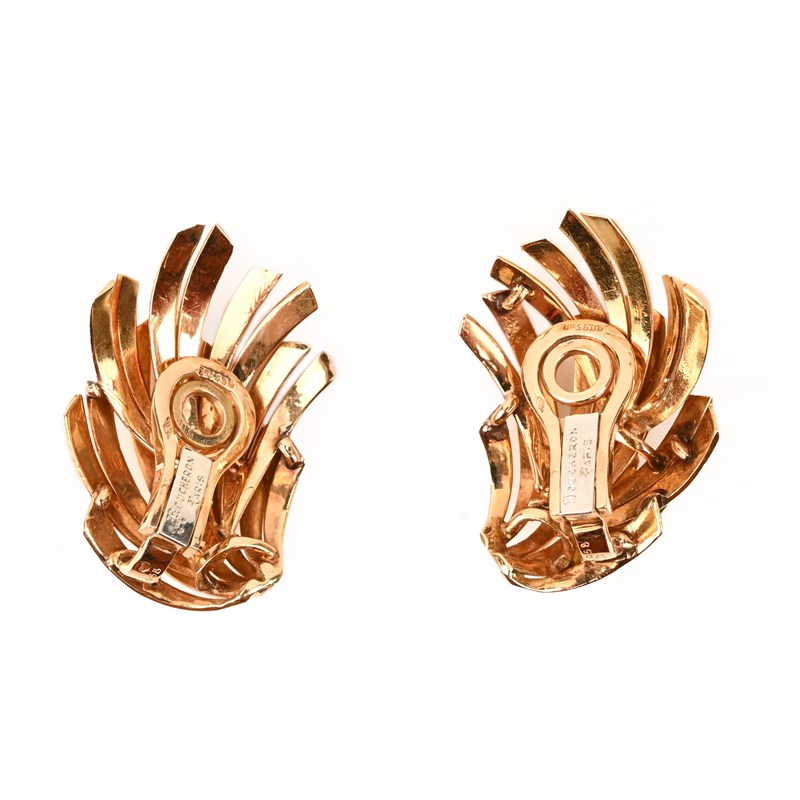BOUCHERON, A PAIR OF GOLD EAR CLIPS, of stylised geometric spray design, maker's mark for André Vassort, signed Boucheron Paris, French control mark, numbered 36.058, length 3cm, 19g