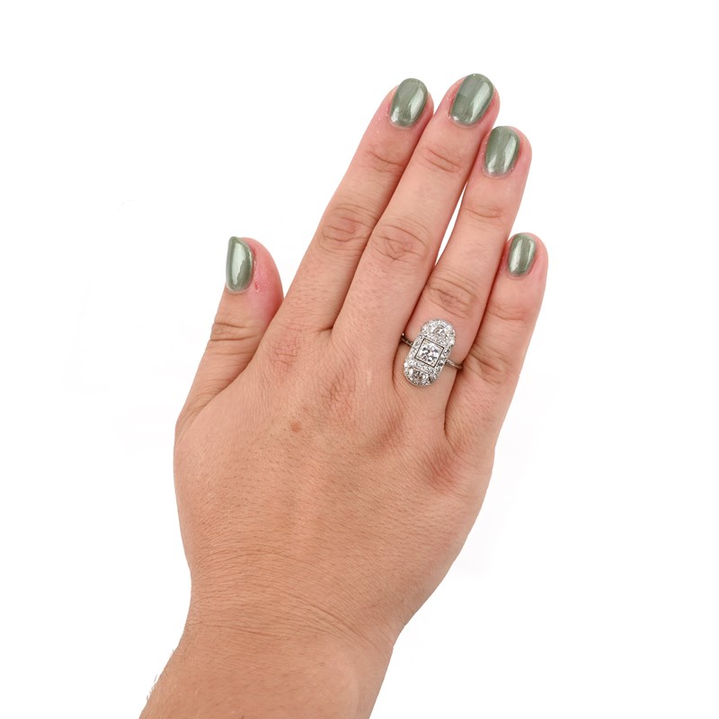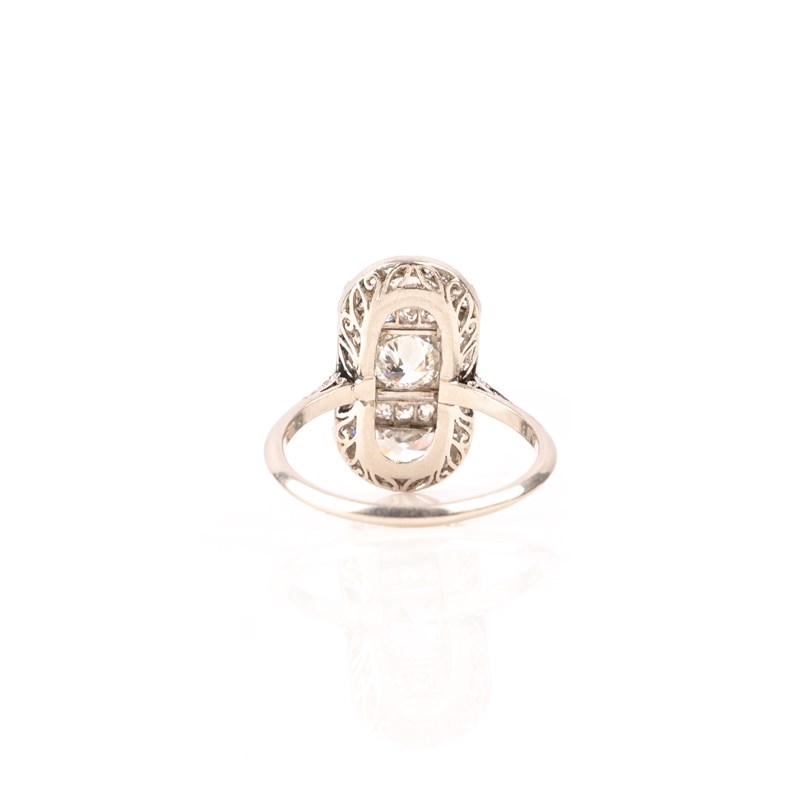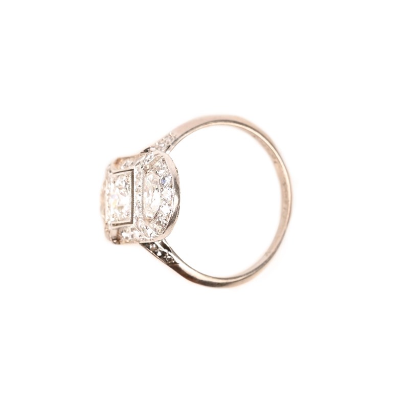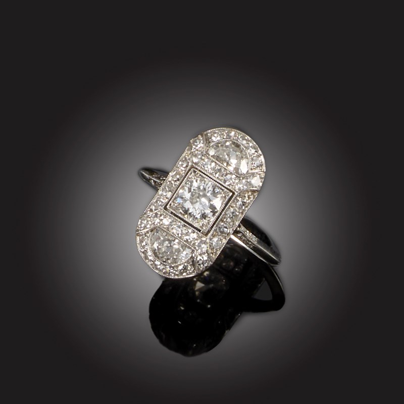 AN ART DECO DIAMOND RING, the central old circular-cut diamond flanked by two demi-lune-shaped diamonds all within a border of millegrain-set graduated diamonds, the shank interior with inscription dated 1931, mounted in platinum, size M