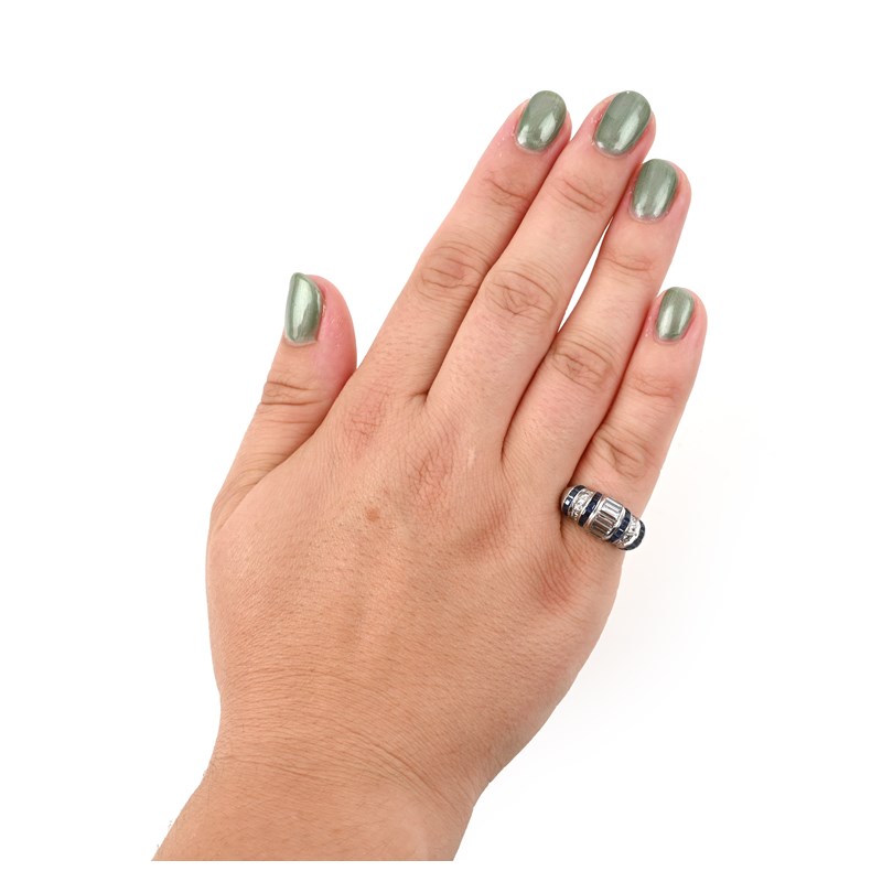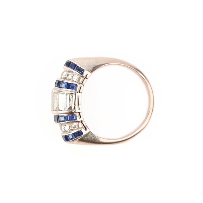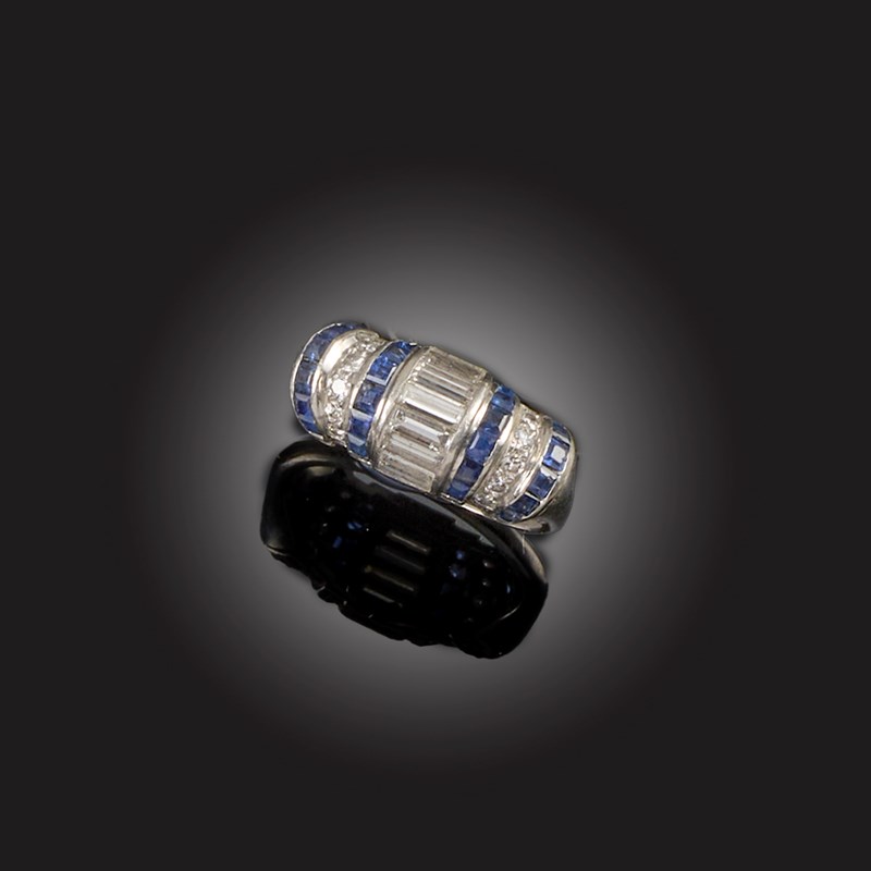 DRAYSON, AN ART DECO SAPPHIRE AND DIAMOND RING, the central domed arrangement of baguette-shaped diamonds between alternating bands of carré-cut sapphires and circular-cut diamonds, mounted in platinum, signed Drayson, size M