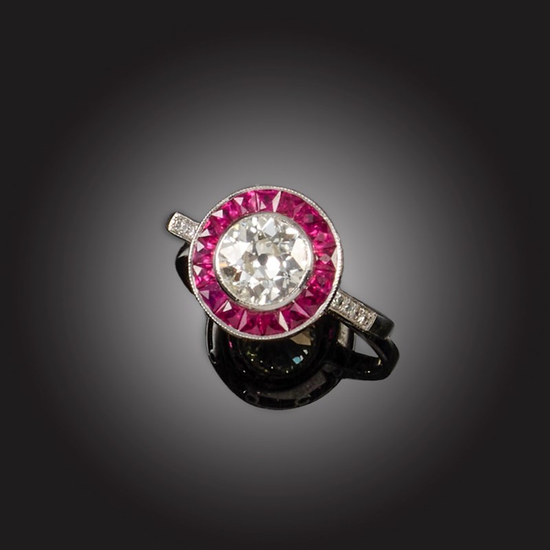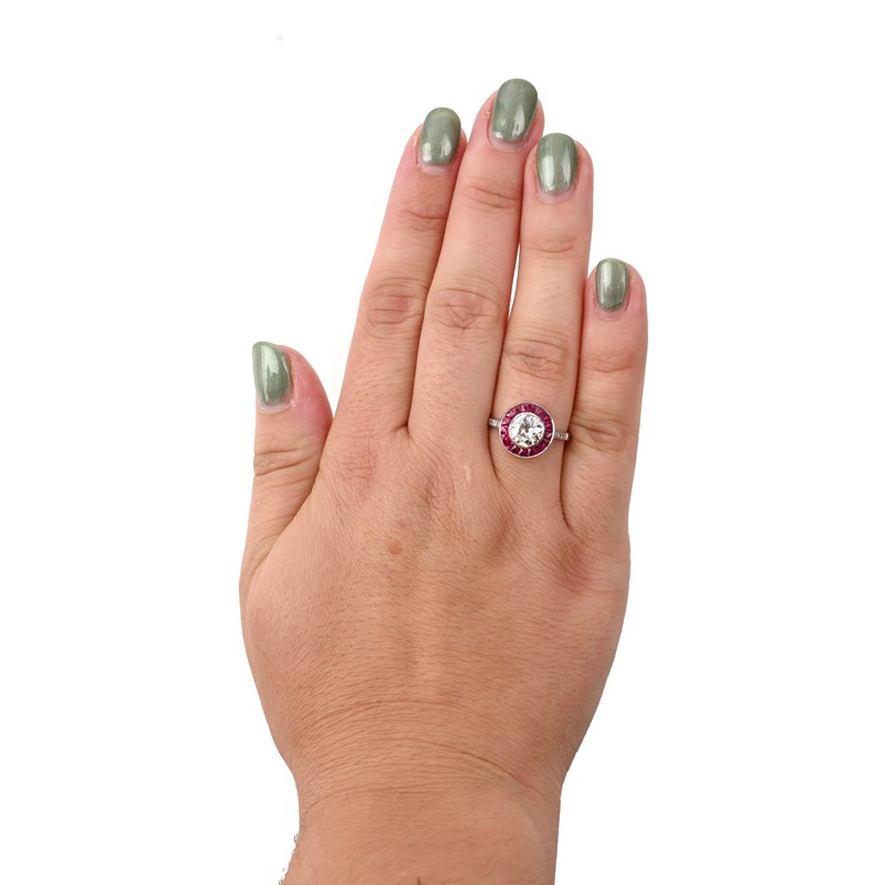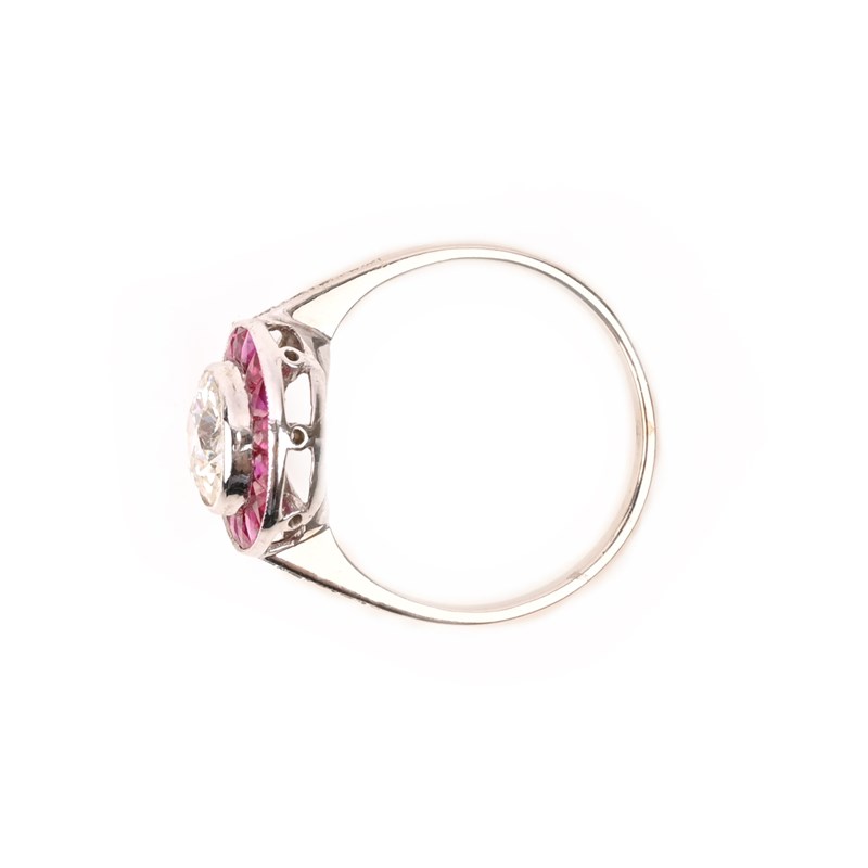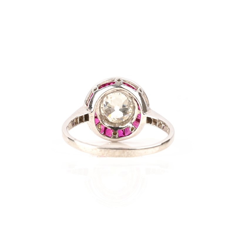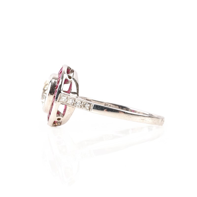 A DIAMOND AND RUBY CLUSTER RING, centred with an old circular-cut diamond weighing approximately 1.00cts within a border of French-cut rubies to diamond-set shoulders, in white gold, stamped 750, size O
