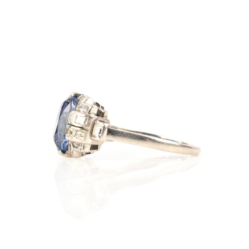 AN ART DECO SAPPHIRE AND DIAMOND RING, set with an oval-shaped sapphire within a geometric surround of scrolled design set with baguette-shaped diamonds, mounted in platinum, French import mark, size I