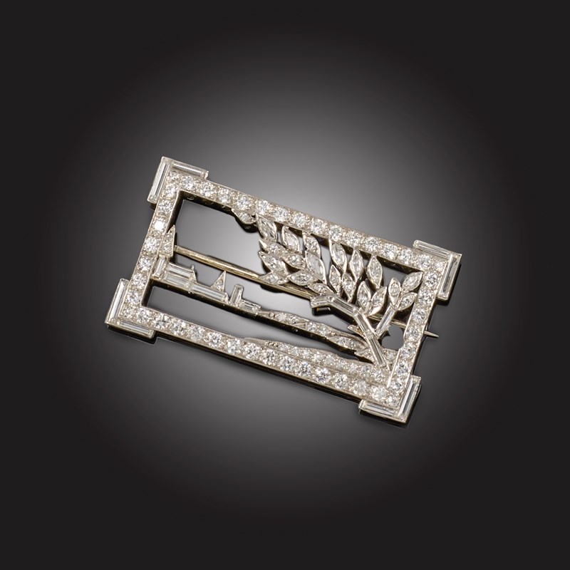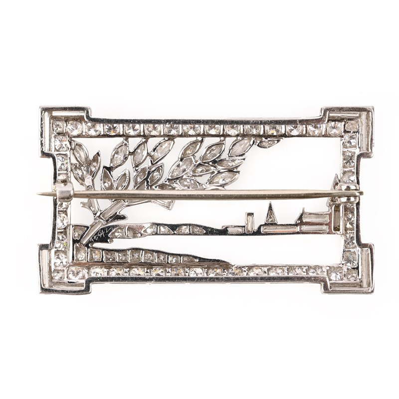 A DIAMOND BROOCH, of openwork design, the rectangular frame enclosing a landscape scene with a stylised tree before a distant townscape, set with circular-cut, baguette-shaped and marquise-shaped diamonds in platinum, numbered 55464 indistinctly, width 4cm