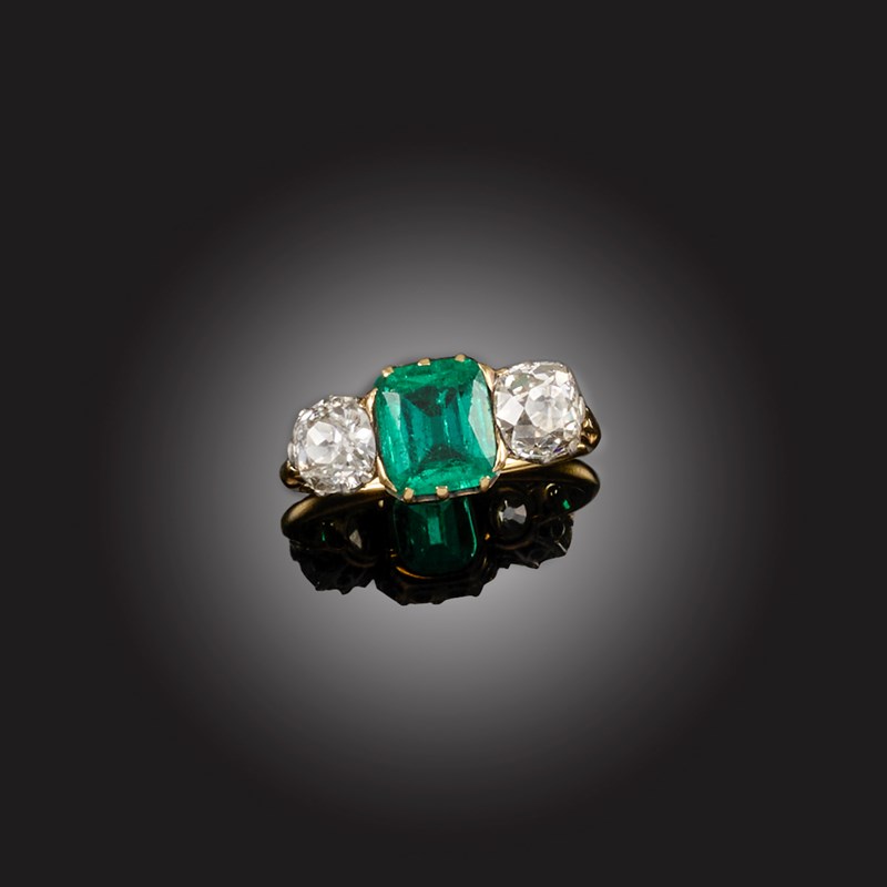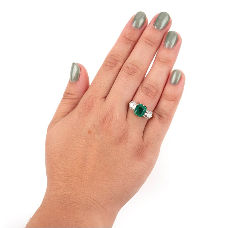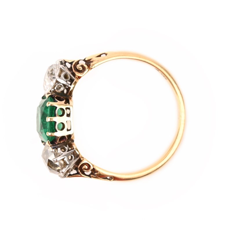 AN EARLY 20TH CENTURY EMERALD AND DIAMOND THREE-STONE RING