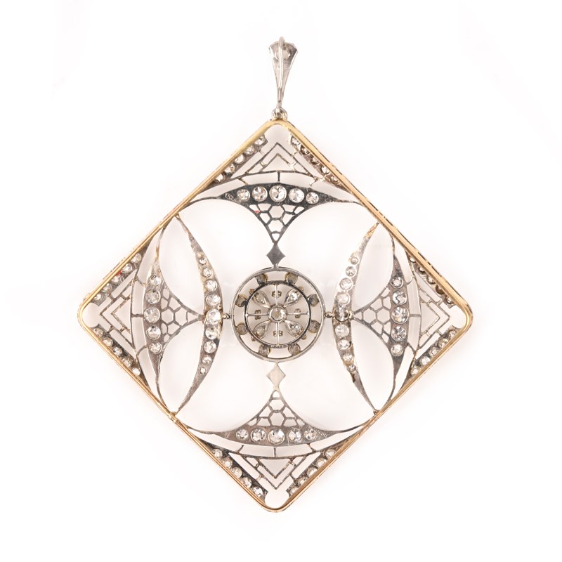 AN EDWARDIAN DIAMOND AND SEED PEARL PENDANT, designed as an openwork lozenge with pierced geometric decoration set with old circular-cut diamonds and accented with seed pearls to the centre, mounted in platinum and gold, length 7cm, gross weight 10g