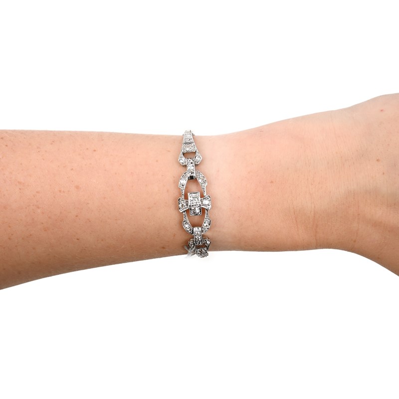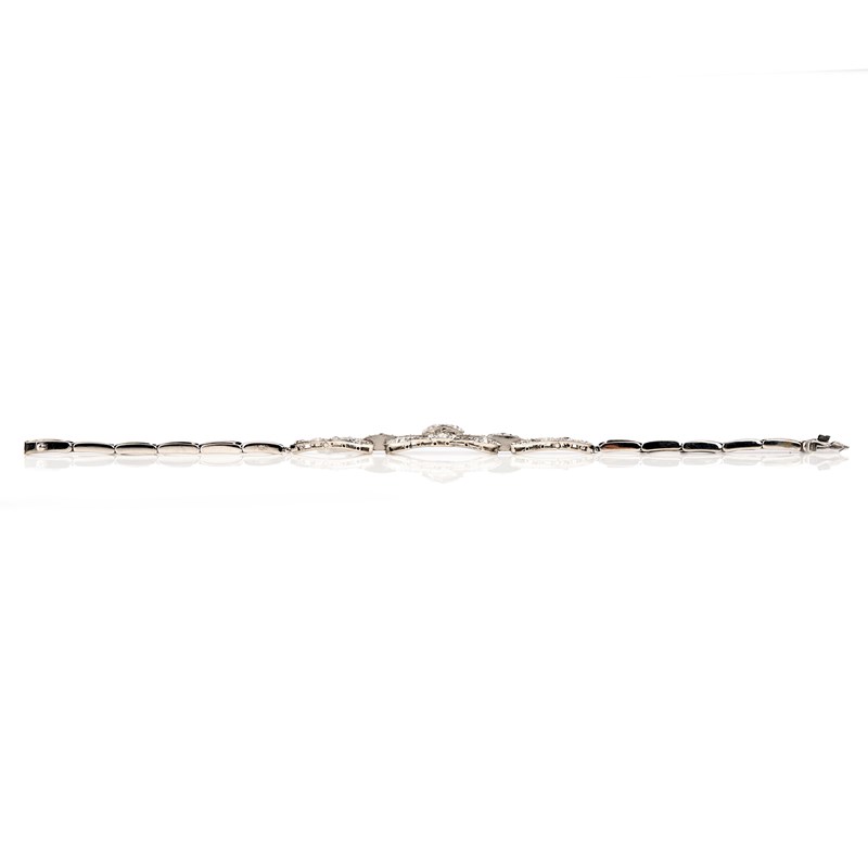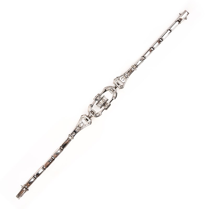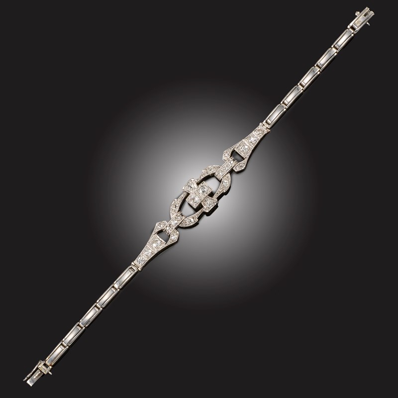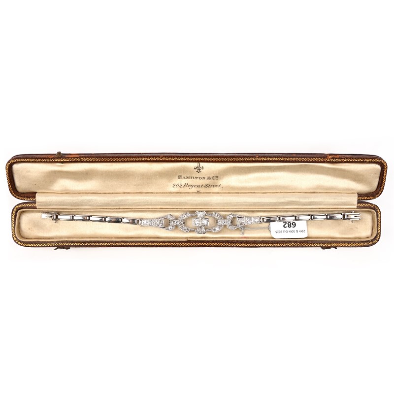 A DIAMOND STRAP BRACELET, centring on a millegrain-set diamond panel on expanding gold bracelet, stamped 18ct, length 17cm, box