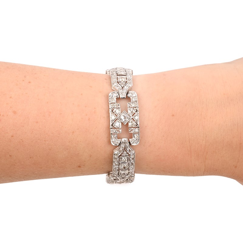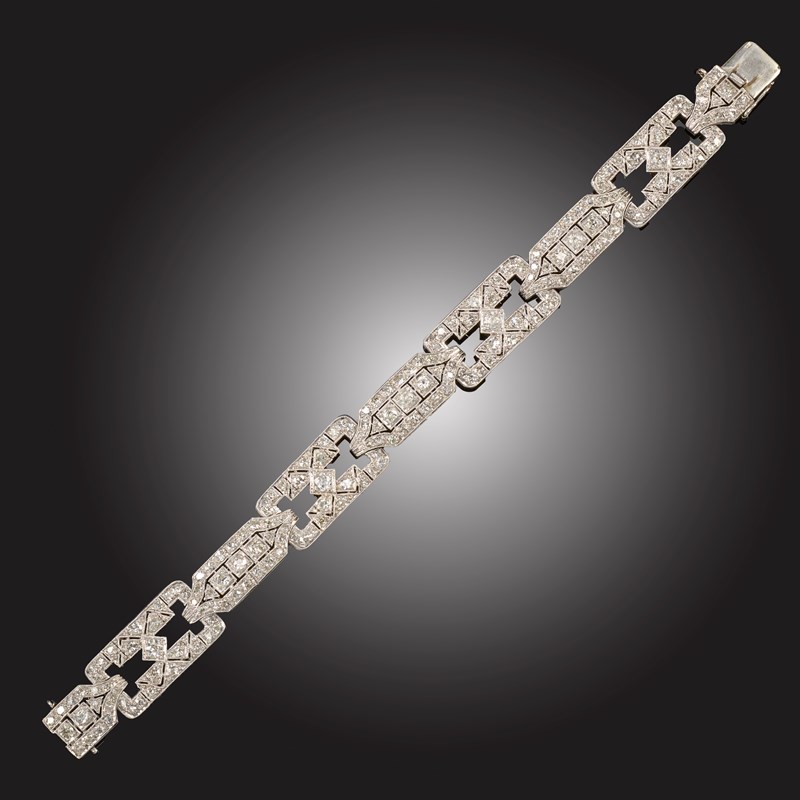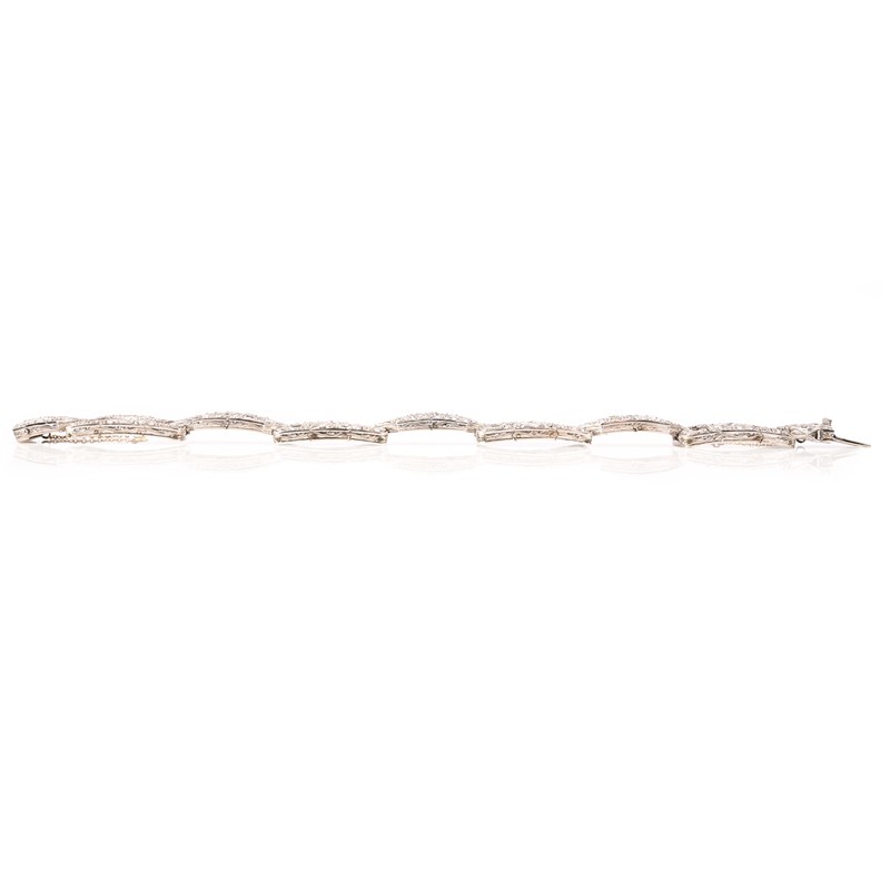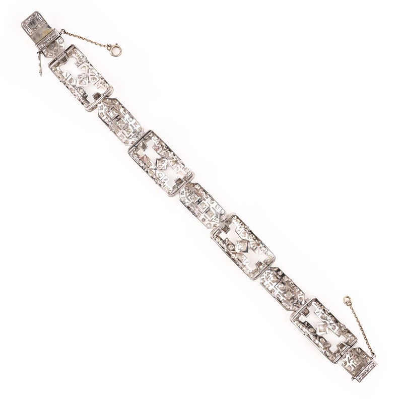 A DIAMOND STRAP BRACELET, composed of alternating articulated links of pierced geometric design, with old circular-cut diamonds in milligrain settings, mounted in platinum, length 18.2cm
