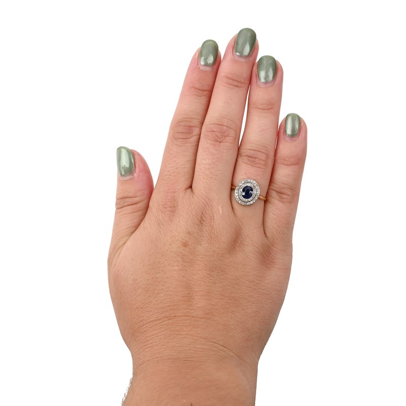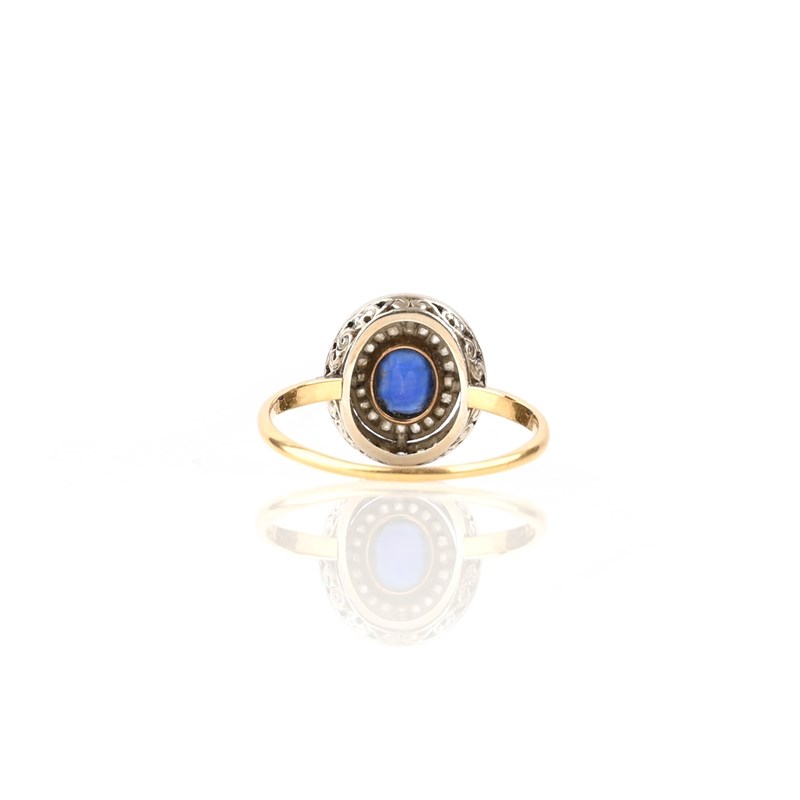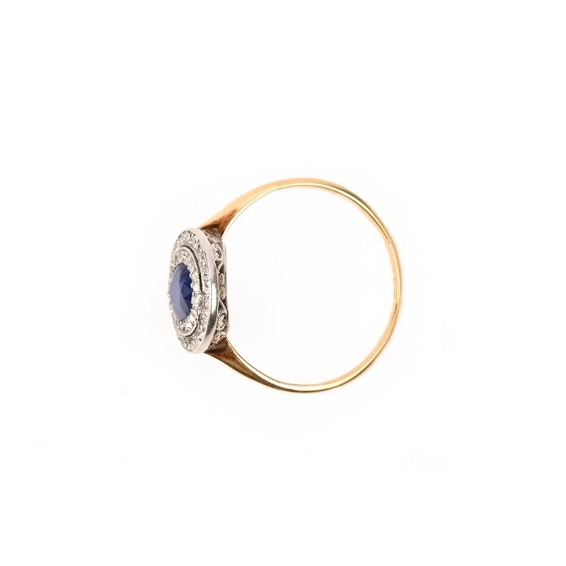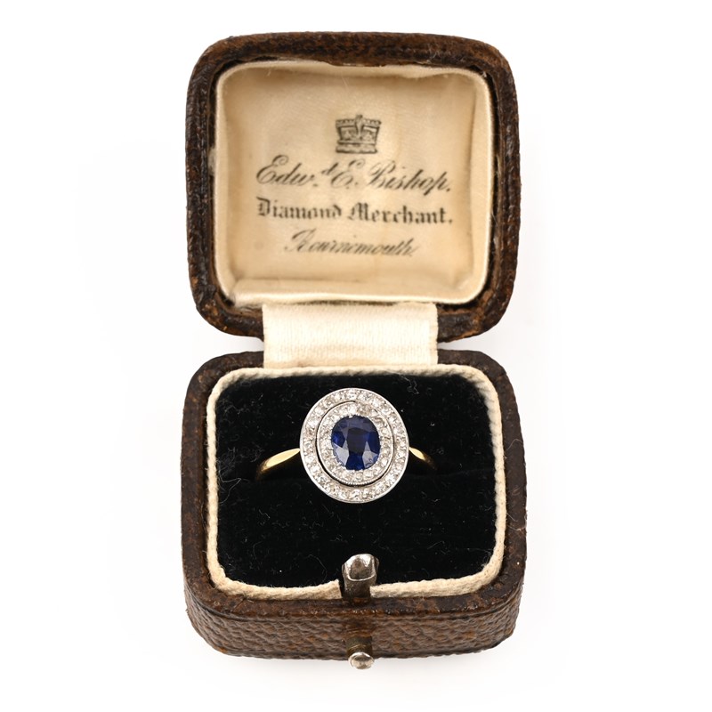 A SAPPHIRE AND DIAMOND CLUSTER RING, EARLY 20TH CENTURY, set with an oval-shaped sapphire within two concentric borders of single-cut diamonds, mounted in platinum and gold, size N, case