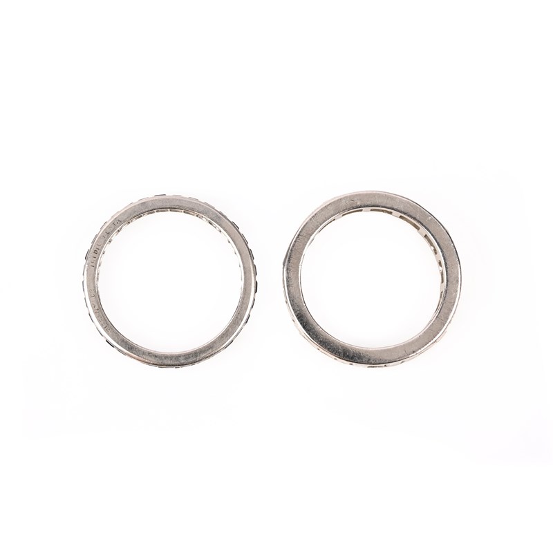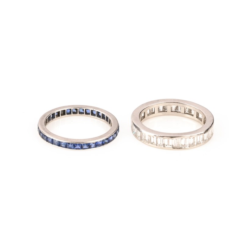 TIFFANY & CO., A SAPPHIRE ETERNITY RING WITH A DIAMOND ETERNITY RING, comprising: Tiffany & Co., an eternity ring set with carré-cut sapphires channel set in platinum, signed Tiffany & Co., stamped Iridic Plat, size J 1/2; and another eternity ring set with baguette-shaped diamonds channel set in platinum, French control marks, size I
