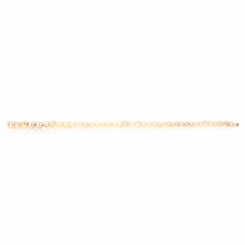A SINGLE ROW NATURAL PEARL NECKLACE, composed of a single strand of pearls, the pearls graduate from approximately 3.9 to 6.7mm on a plain gold clasp, stamped 18K, length 51.5cm