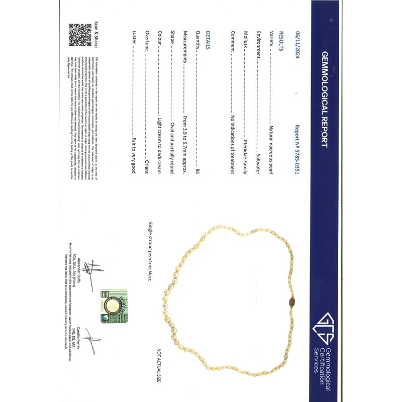 Accompanied by GCS report number 5785-0351 dated 6th November 2024 stating that the 84 cream to dark cream pearls are natural saltwater