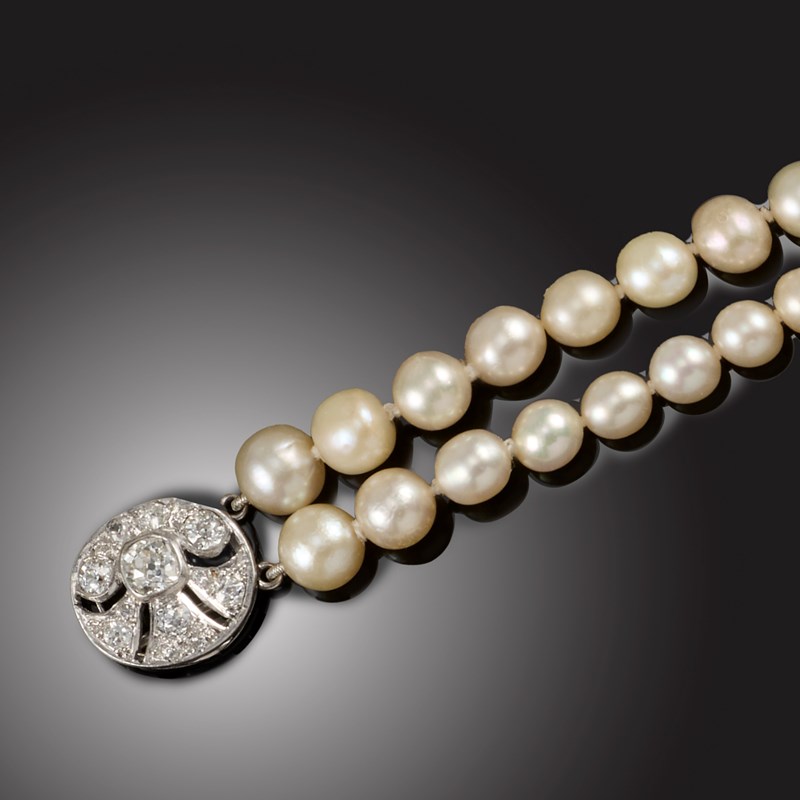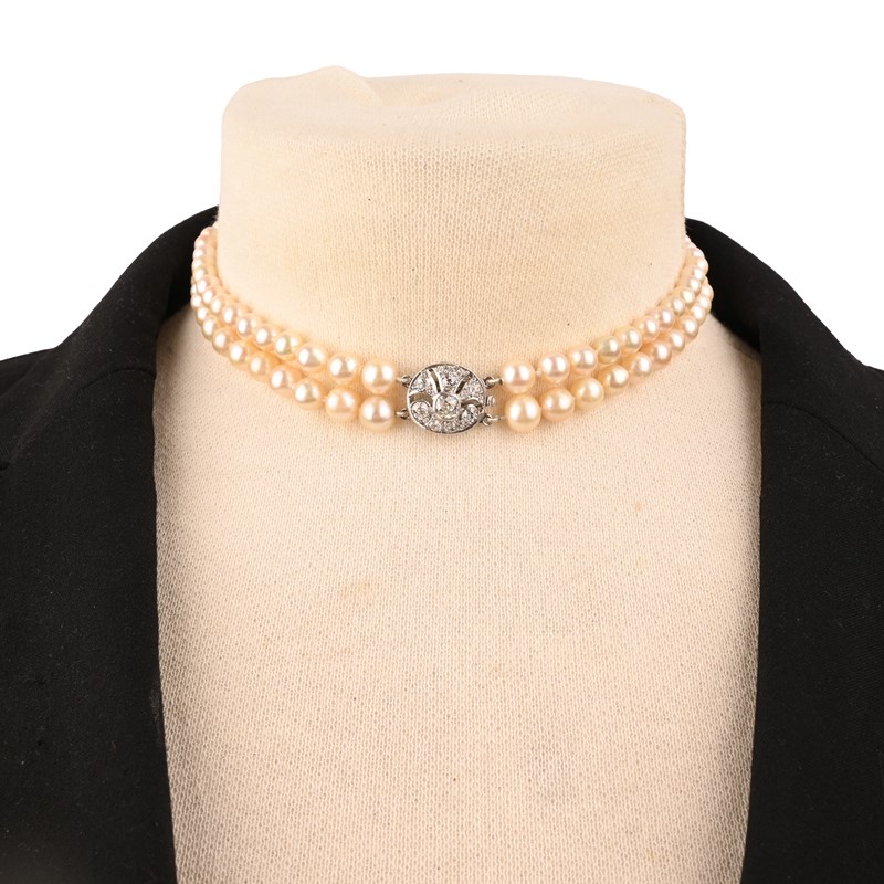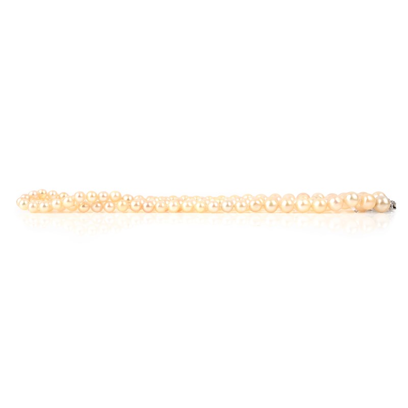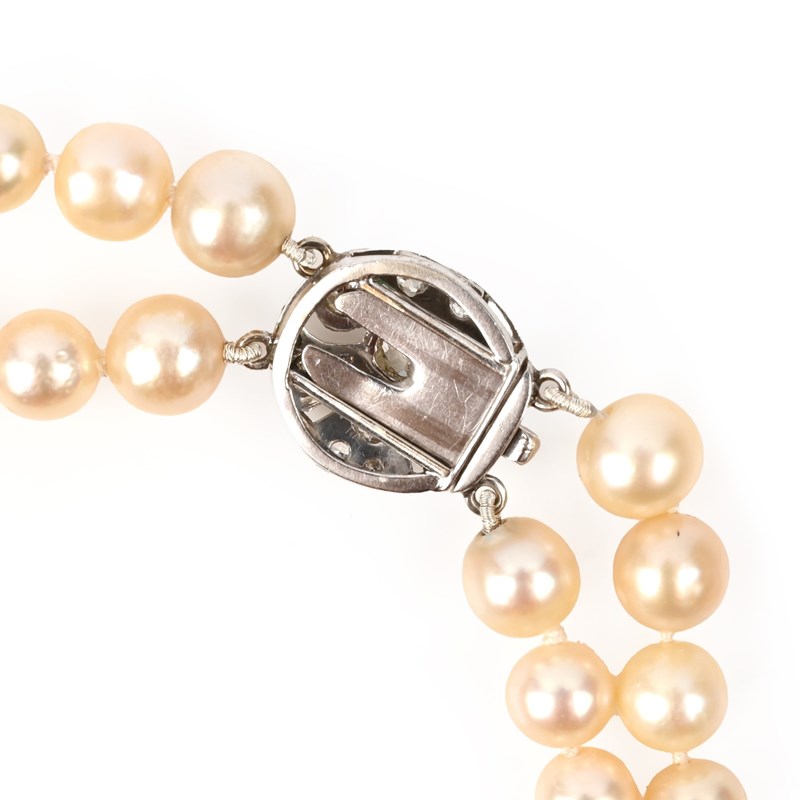 A PEARL AND DIAMOND NECKLACE, composed of two rows of graduated pearls measuring 4.7-7.6mm, to a white gold clasp set with cushion-shaped diamonds, one pearl cultured, length 35cm