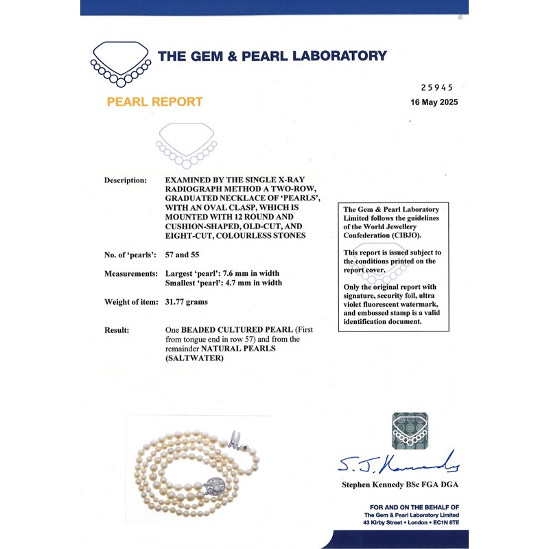Accompanied by Gem & Pearl Laboratory report number 25945 dated 16th May 2025 stating that 112 pearls measuring 4.7-7.6mm are natural saltwater, except from one beaded cultured pearl (first from tongue end in the row of 57 pearls)