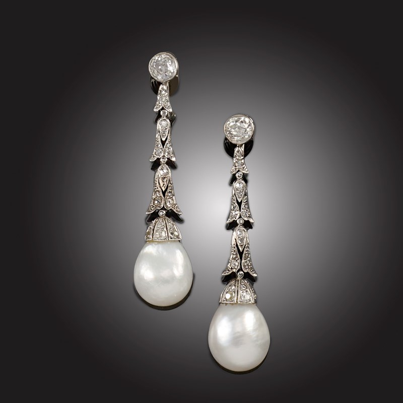 A PAIR OF PEARL AND DIAMOND DROP EARRINGS, each drop-shaped pearl suspended from articulated diamond surmounts, millegrain-set beneath an old circular-cut diamond in white gold, screw fittings with safety hooks, length 4.8cm