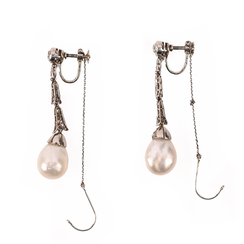 A PAIR OF PEARL AND DIAMOND DROP EARRINGS