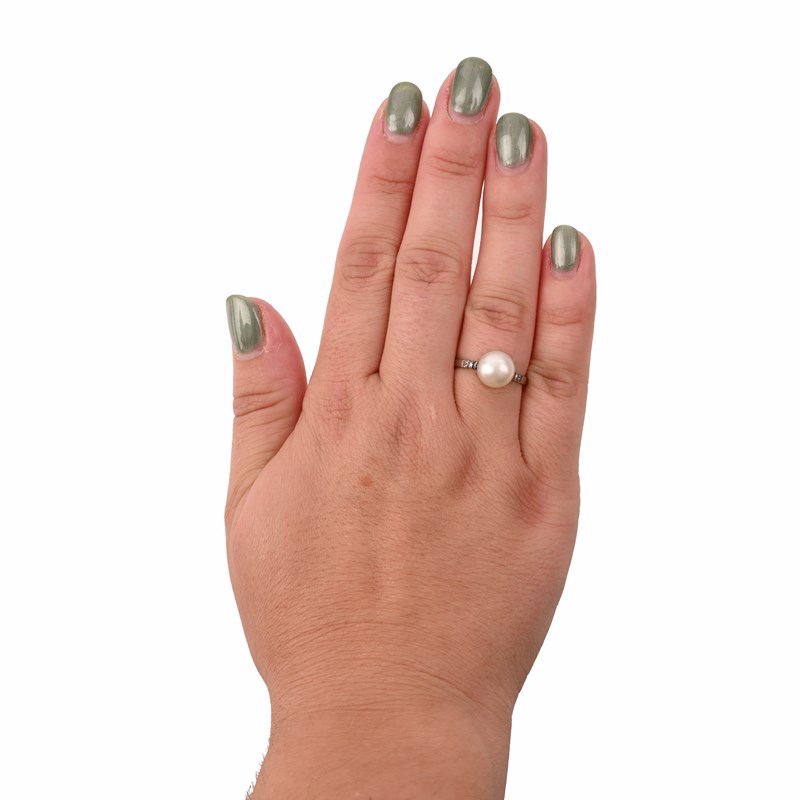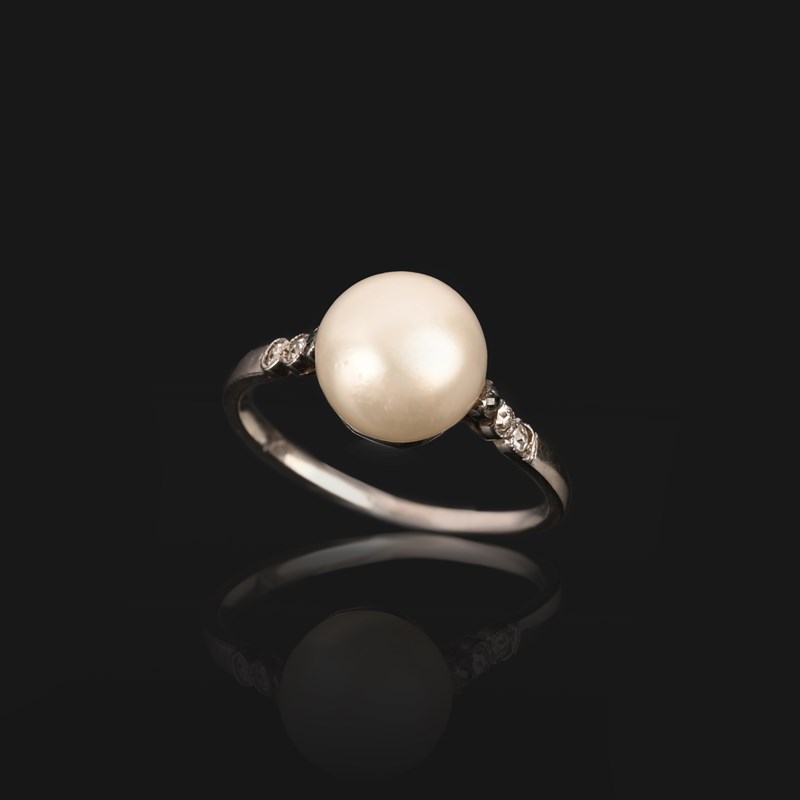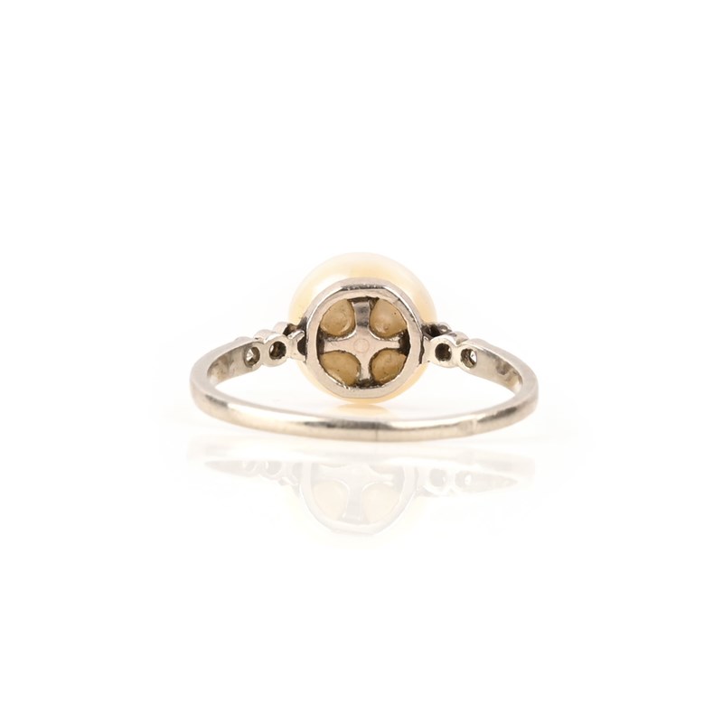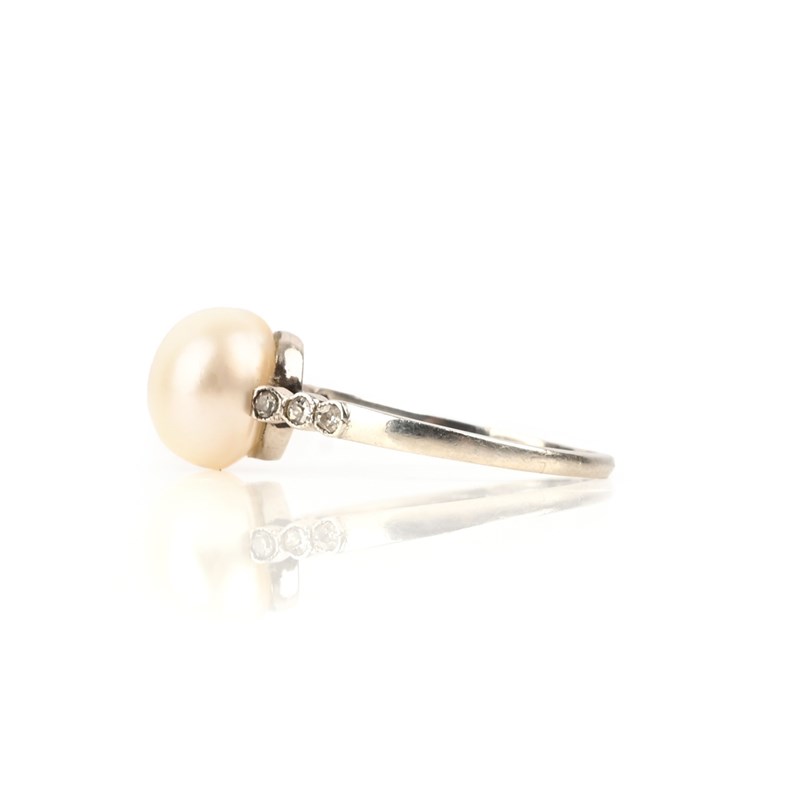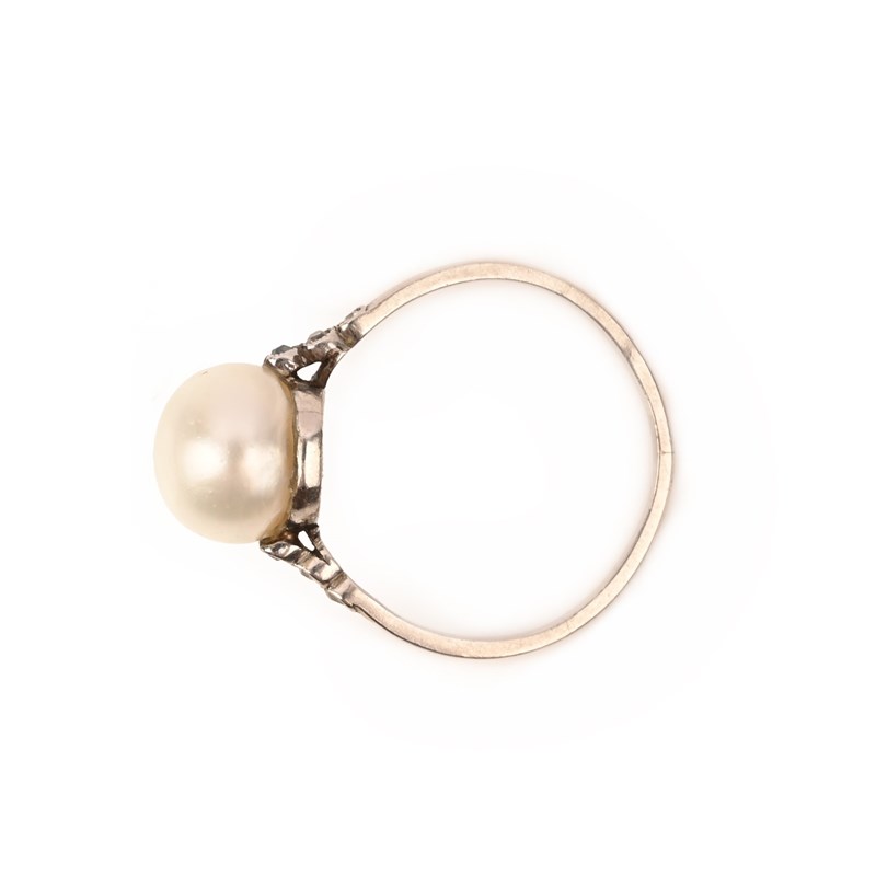 A NATURAL PEARL AND DIAMOND RING, the button-shaped pearl measures approximately 8.70mm, with diamond-set shoulders in platinum, size N