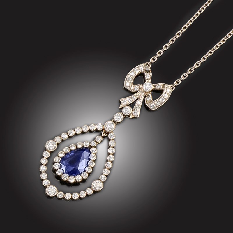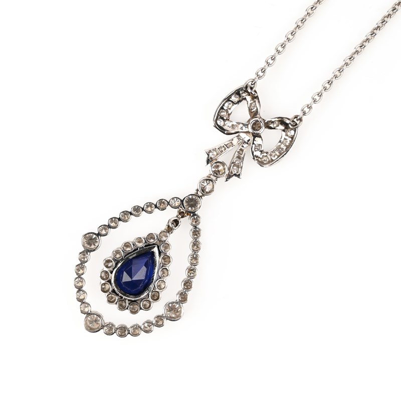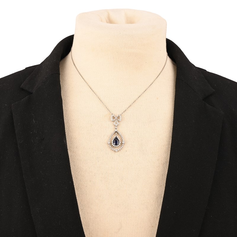 A SAPPHIRE AND DIAMOND PENDANT NECKLACE, set with a pear-shaped sapphire within a diamond border, suspended from a collet-set round brilliant-cut diamond set frame and diamond-set bow, in white gold and platinum, to a fine link platinum chain, chain stamped 950, PLAT, pendant length 4cm, chain length 38cm