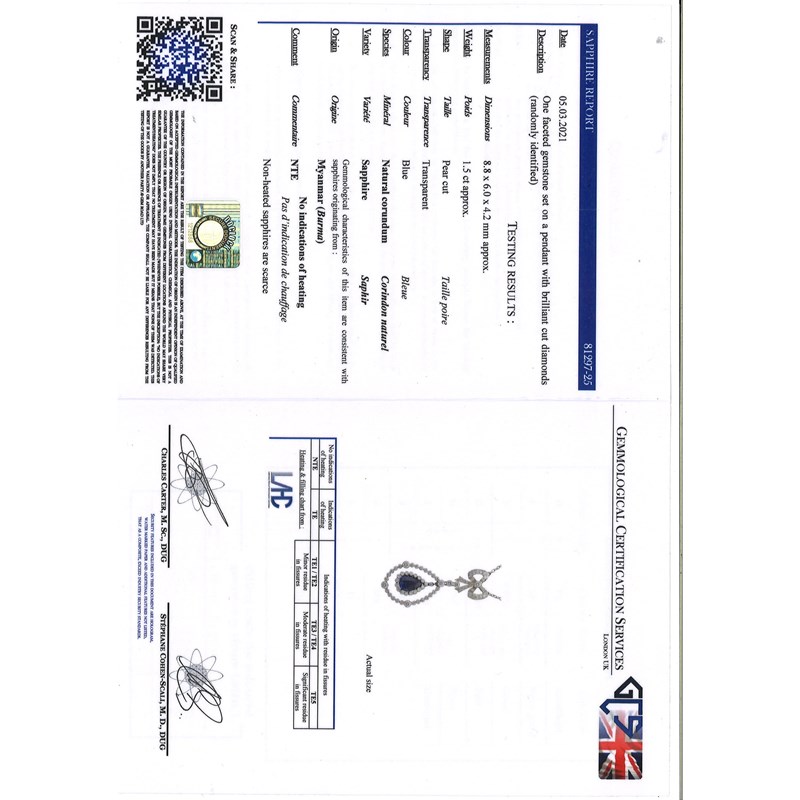 Accompanied by GCS report number 81297-25 dated 5th March 2021 stating that the pear-shaped sapphire weighing approx. 1.50cts is natural with no indications of heat treatment, origin: Myanmar (Burma)