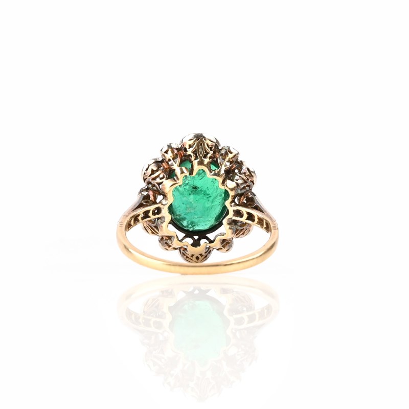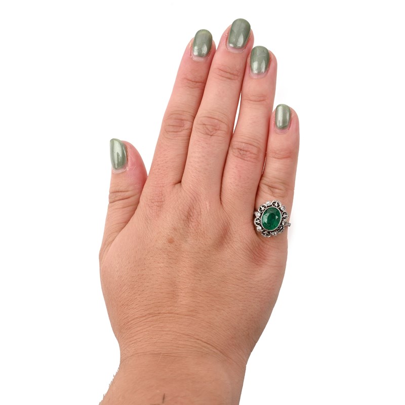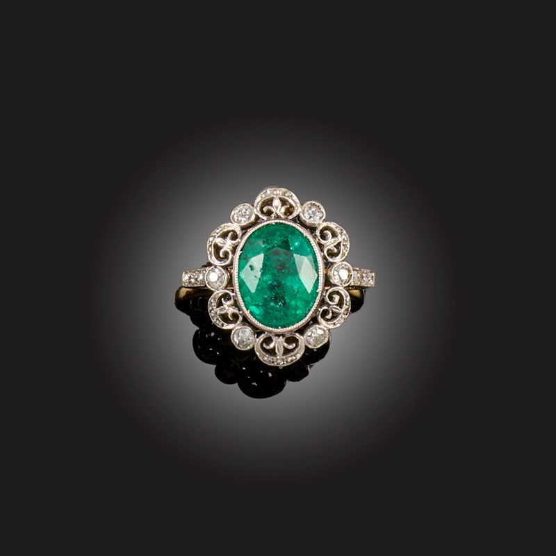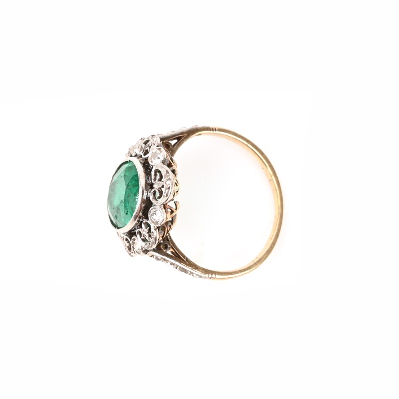 AN EMERALD AND DIAMOND CLUSTER RING, the oval-shaped emerald millegrain-set within scroll surround set with diamonds, with further diamond shoulders in platinum and gold, size K 1/2
