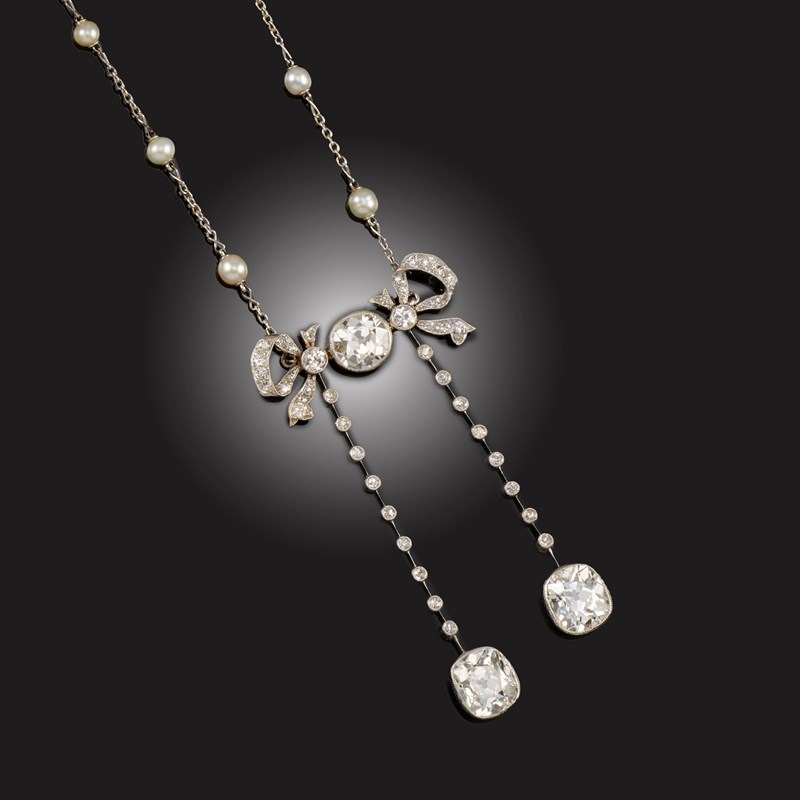 A BELLE ÉPOQUE DIAMOND AND PEARL PENDANT NECKLACE, of negligée design, centred with an old circular-cut diamond, weighing approximately 1.60cts, milligrain-set between diamond-set ribbon-tie motifs, suspending two rows of knife-edge linking accented with single-cut diamonds, each suspending a milligrain-set cushion-shaped diamond, the diamond on the left weighing approximately 3.00cts and the diamond on the right weighing approximately 2.80cts, all in platinum, to a fine link platinum back chain set with pearls, pearls untested, pendant length 6cm, chain length 51cm