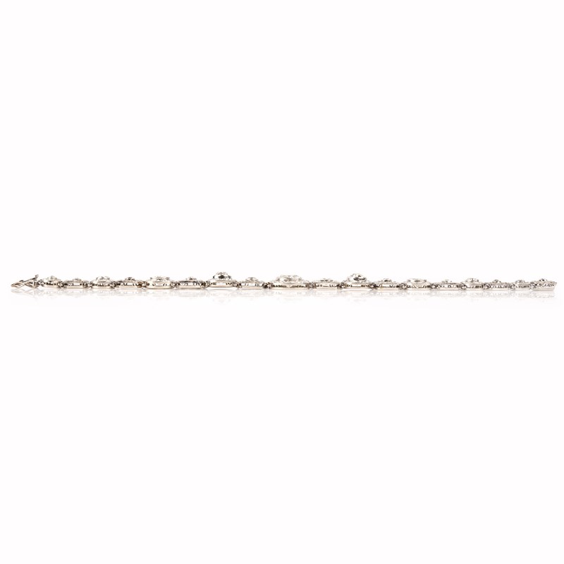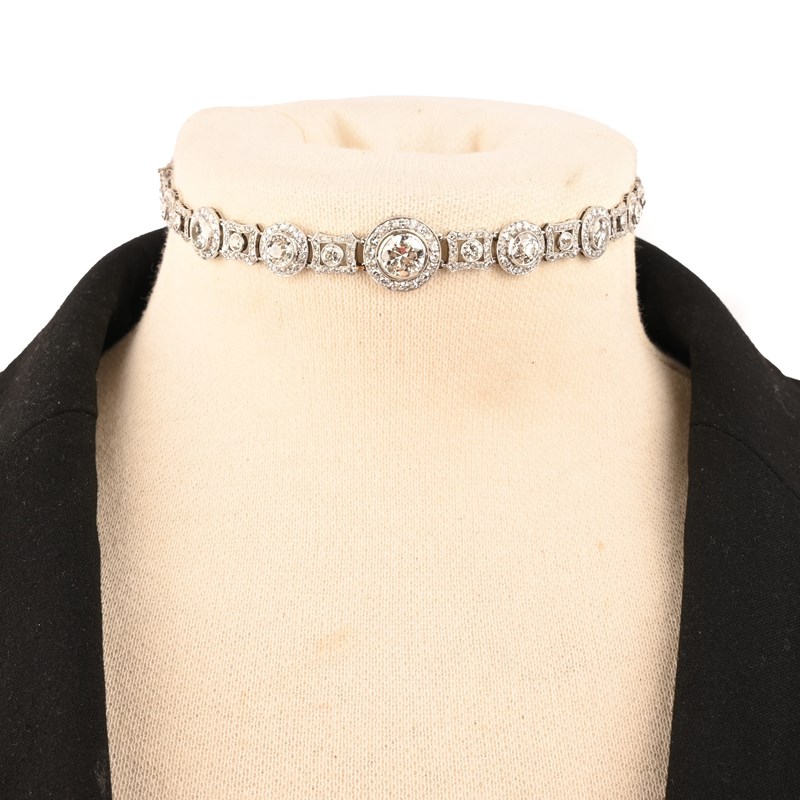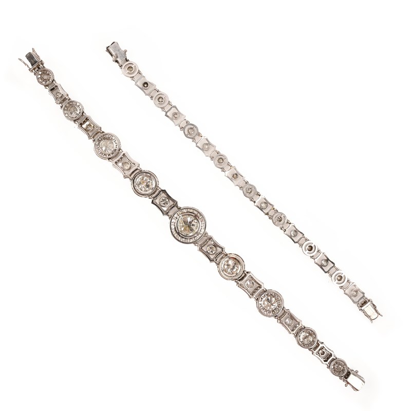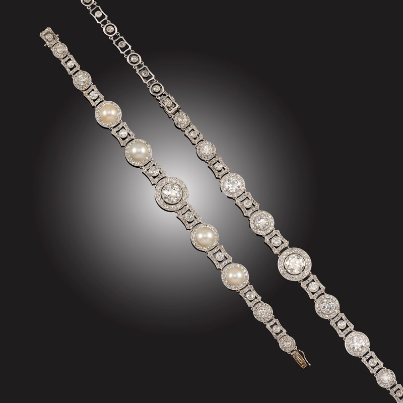 AN ART DECO PEARL AND DIAMOND CONVERTIBLE DEMI PARURE, comprising: a bracelet, set with four graduated natural and cultured pearls flanking a central old circular-cut diamond weighing approximately 1.90cts, all within surrounds of milligrain-set rose-cut diamonds, alternating with diamond-set pierced links of waisted square form, in platinum, length 17.5cm; another bracelet of similar design, set with graduated old circular-cut diamonds within diamond surrounds, the central diamond weighing approximately 1.90cts, alternating with diamond-set waisted square links, in platinum, length 17.5cm; and a back chain, formed of pierced circular and waisted square links, each centred with a millegrain-set old circular-cut diamond, in platinum, length 14cm, either bracelet can be attached to the back chain to be worn as a choker necklace, total length 31.5cm, or separately as a pair of bracelets