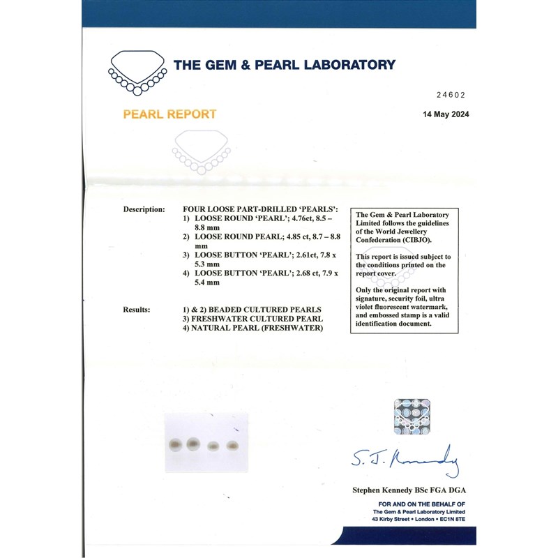 Accompanied by Gem & Pearl Laboratory report number 24602 dated 14th May 2024 stating that the button pearl weighing 2.68cts and measuring 5.4 x 7.9mm is natural freshwater, the button pearl weighing 2.61cts and measuring 5.3 x 7.8mm is cultured freshwater, the round pearl weighing 4.76cts and measuring 8.5-8.8mm is beaded cultured, and the round pearl weighing 4.85cts and measuring 8.7-8.8mm is beaded cultured