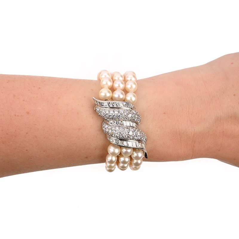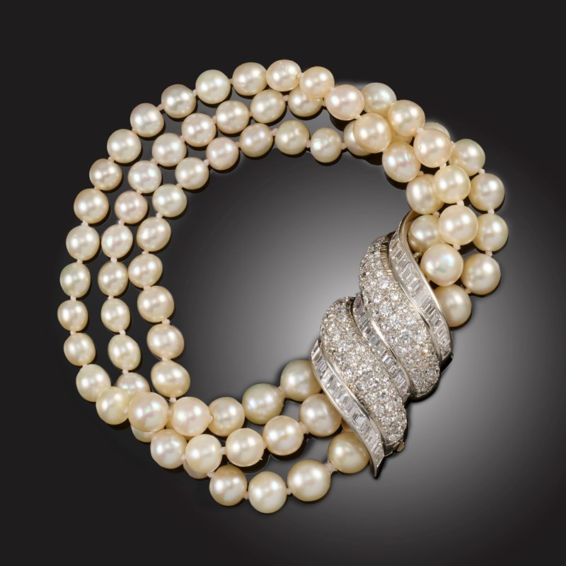 VAN CLEEF & ARPELS, A NATURAL PEARL AND DIAMOND BRACELET, CIRCA 1950, the three rows of natural pearls graduating from approximately 5.65 - 7.32mm, centring on a diamond-set clasp, designed as alternately-set scrolls of baguette-shaped and circular-cut diamonds of undulating design, signed Van Cleef & Arpels and numbered 7.637 - CS, with maker's lozenge for Charles Profilet, length 19.5cm