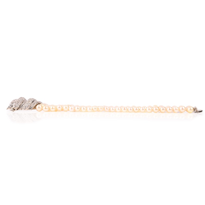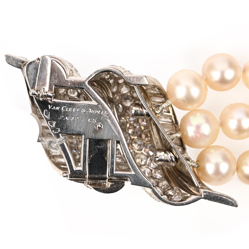 Already desirable for the quality of its natural pearls, the present lot is particularly interesting for the striking design of its large scrolling clasp. Van Cleef & Arpels first introduced this new style of jewellery with the release of the 'Flamme' brooch in 1934. This design, which has now achieved iconic status in Van Cleef & Arpels' oeuvre, pioneered the shift away from the angular and more abstract geometric forms of the earlier Art Deco period. Its scrolling design, similar to a flame, from which the French name 'Flamme', introduced the taste from more organic forms and gentler curvilinear shapes that heralded the taste for the softer style of mid-century jewellery. With the 1937 Exposition Internationale des Arts et Techniques dans la Vie Moderne, this new taste for curves and arabesques was firmly established, and the tone was set for the following two decades. Skilled craftmanship was at the heart of this new style, with the large design houses sourcing their pieces from the exceptional workshops active in Paris at the time, including that of Charles Profilet, whose work bares the distinctive maker's lozenge with 'CH P' followed by mistletoe. Into the 1950s, the popularity of scrolling features in jewellery continued, often featured alongside natural pearls. Van Cleef & Arpels famously combined these elements in Princess Grace of Monaco's marriage set, dated 1955-1956, which included a three-strand pearl necklace detailed with two bold scrolling links. The present lot is firmly set within this tradition, and speaks of all the quality and exceptional design that characterises Van Cleef & Arpels jewellery.