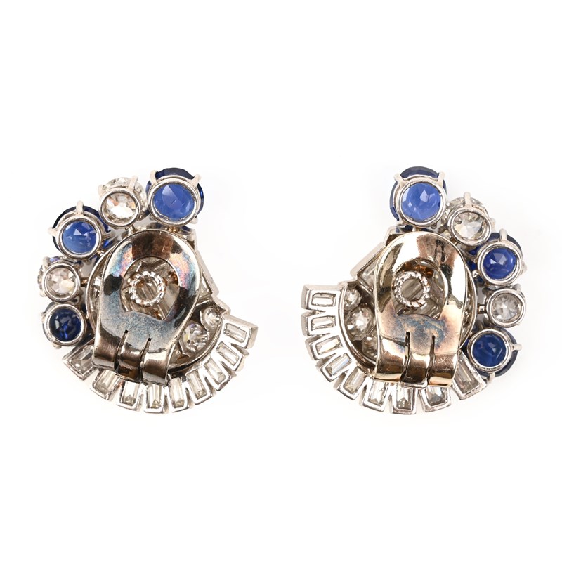 A PAIR OF SAPPHIRE AND DIAMOND EARCLIPS, CIRCA 1940, of stylised crescent design, each centred with three graduated baguette-shaped diamonds within a surround pavé-set with old circular-cut diamonds, within a splayed border set with sapphires alternating with two old circular-cut diamonds tapering to a border of graduated baguette-shaped diamonds in platinum, gold clip fittings, width 2.5cm