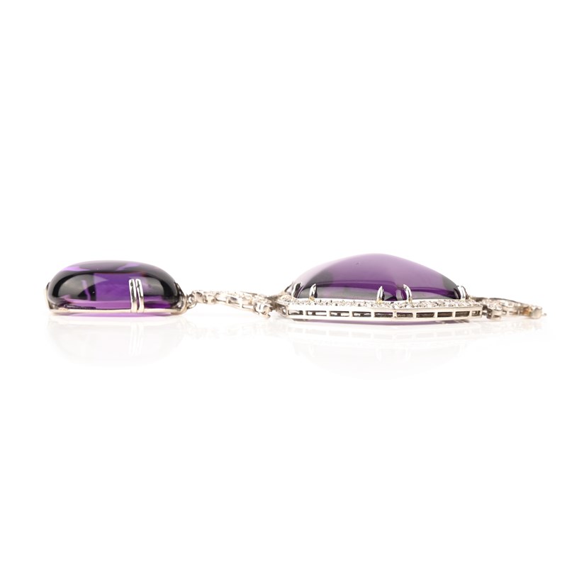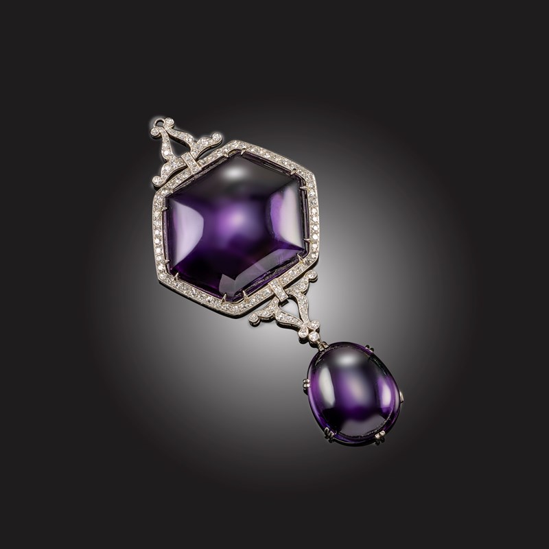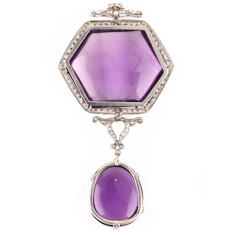 AN EARLY 20TH CENTURY AMETHYST AND DIAMOND PENDANT, set with a hexagonal cabochon amethyst measuring approximately 3.7 x 2.9 x 1.1cm, within a surround of single-cut diamonds in milligrain settings, suspending a diamond-set scrollwork link and a claw-set oval cabochon amethyst measuring 2.3 x 2 x 0.9cm, mounted in platinum, length 9.4cm